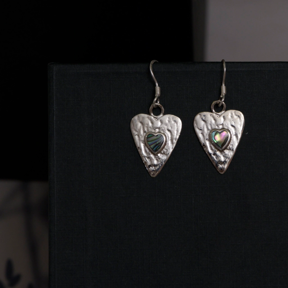 These Abalone Heart Earrings are a beautiful blend of rustic charm and iridescent shimmer, these handcrafted silver earrings feature a unique hammered texture and a luminous abalone heart inlay.