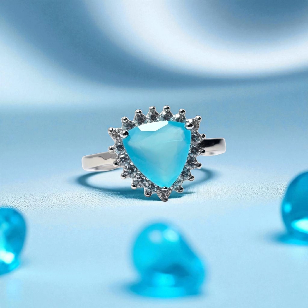 A uniquely elegant aqua blue trillion-cut gemstone encircled by shimmering CZs, this Aqua Blue Glint Ring brings oceanic calm and modern charm to your style.