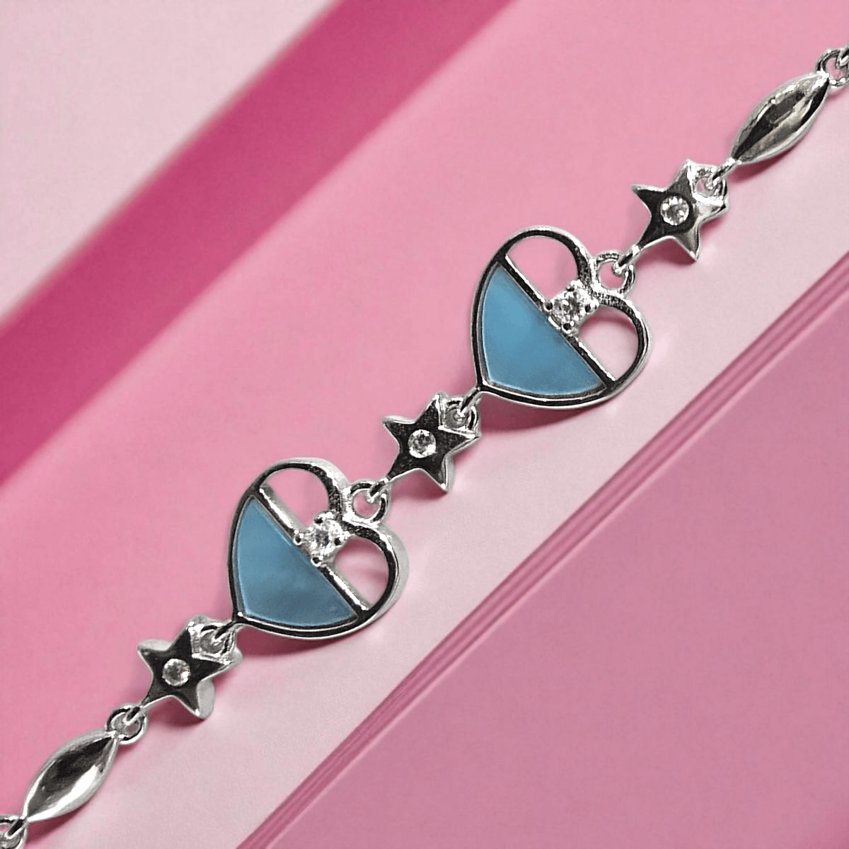 Whimsical and radiant, this Aqua Heart Star Bracelet blends heart-shaped frames, dreamy star charms, and ocean-hued shell enamel – all set in polished 925 silver for a celestial touch.