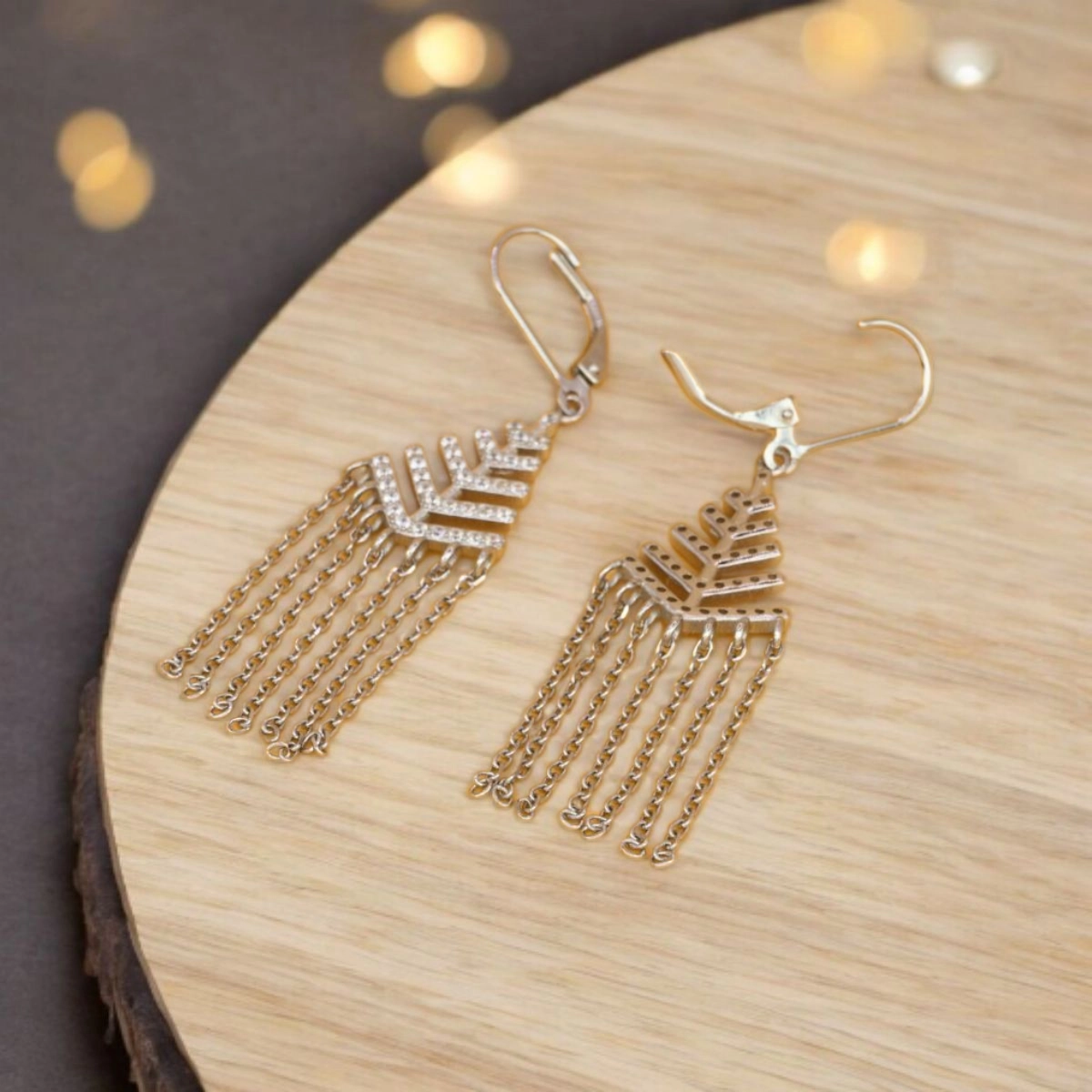 Make an unforgettable entrance with our Art Deco CZ Tassel Earrings. Inspired by the glamour of a bygone era, these exquisite earrings are designed to move and shimmer with you, adding a dramatic and sophisticated flair to any evening look. The design begins with a stunning geometric top, meticulously paved with brilliant cubic zirconia stones. Cascading from this radiant base is a fringe of delicate 925 silver chains, forming a tassel that sways and catches the light beautifully. A secure lever-back closure ensures they stay comfortably in place all night long.
