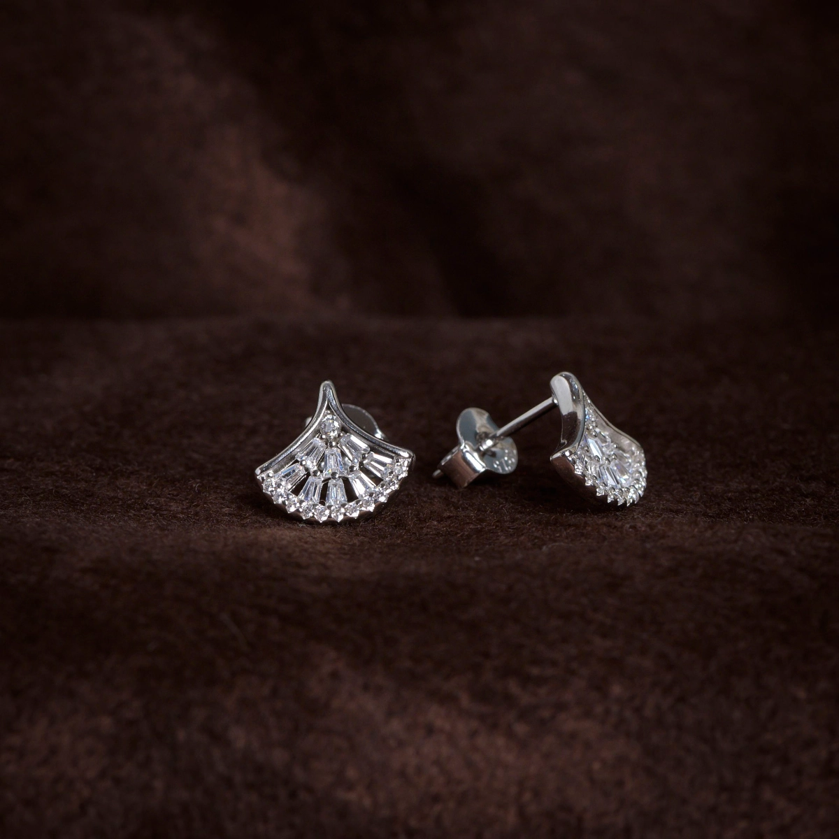 This Art Deco Fan Pendant Set is a vintage-inspired sterling silver set featuring fan shaped motifs paved with tapered baguette and round CZ—complete with a delicate chain necklace and matching studs.