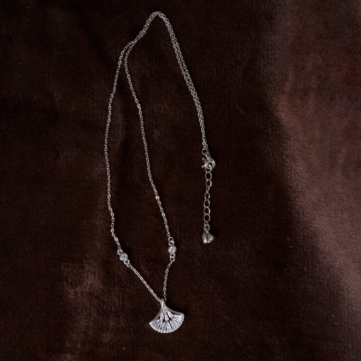 - Necklace: Fan pendant on adjustable fine chain; secure clasp