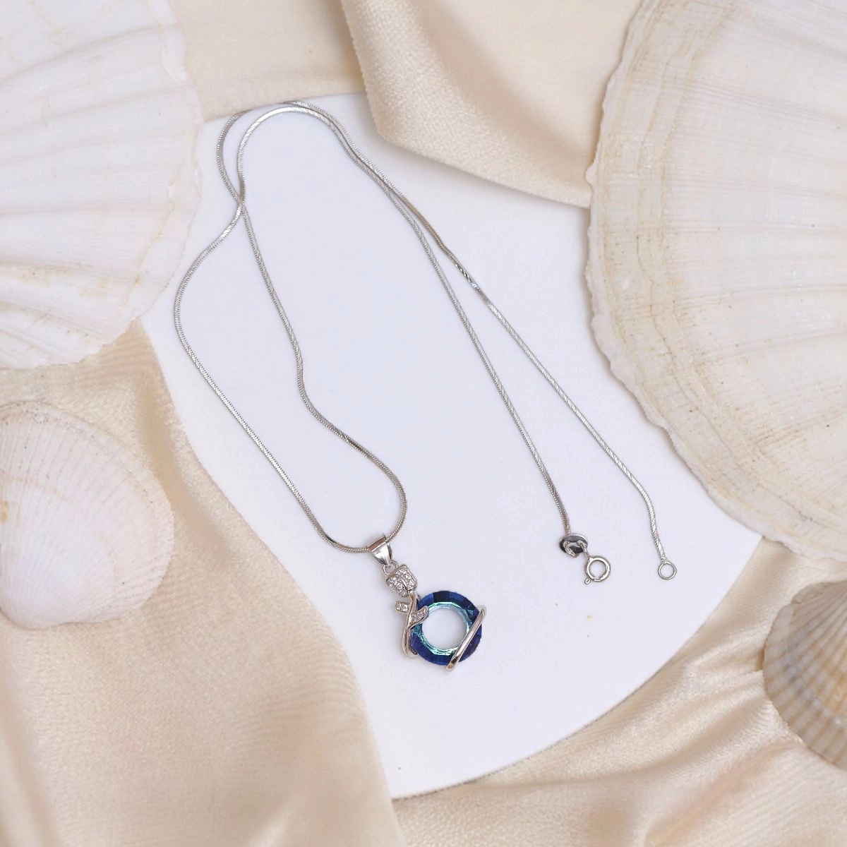 This Azure Bloom Pendant Necklace captures the serene beauty of nature and the sparkle of fine craftsmanship. The centerpiece is a vibrant, precision-cut blue crystal ring that reflects shades of turquoise and sapphire with every movement. A finely detailed sterling silver flower motif, adorned with glittering cubic zirconia, rests gracefully atop the crystal—symbolizing beauty, growth, and renewal. Suspended from a sleek snake chain, this pendant adds a refreshing splash of color to any outfit while maintaining a refined, timeless appeal.