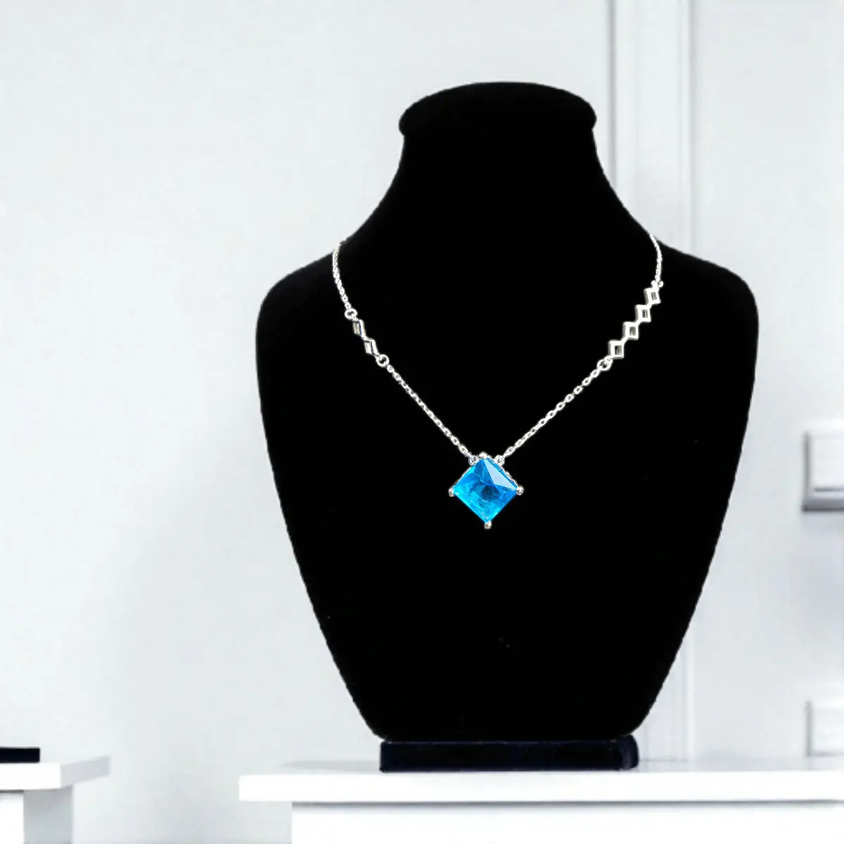 Make waves with this breathtaking Azure Prism Necklace that blends structure with shimmer. At its heart lies a luminous ocean-blue princess-cut stone, suspended on a sleek silver chain accentuated by interlocked geometric shapes. The asymmetrical design adds a contemporary flair, perfect for those who love a bold twist on minimalism. Whether layered over a crisp white shirt or paired with an evening gown, this necklace makes a confident yet refined statement.