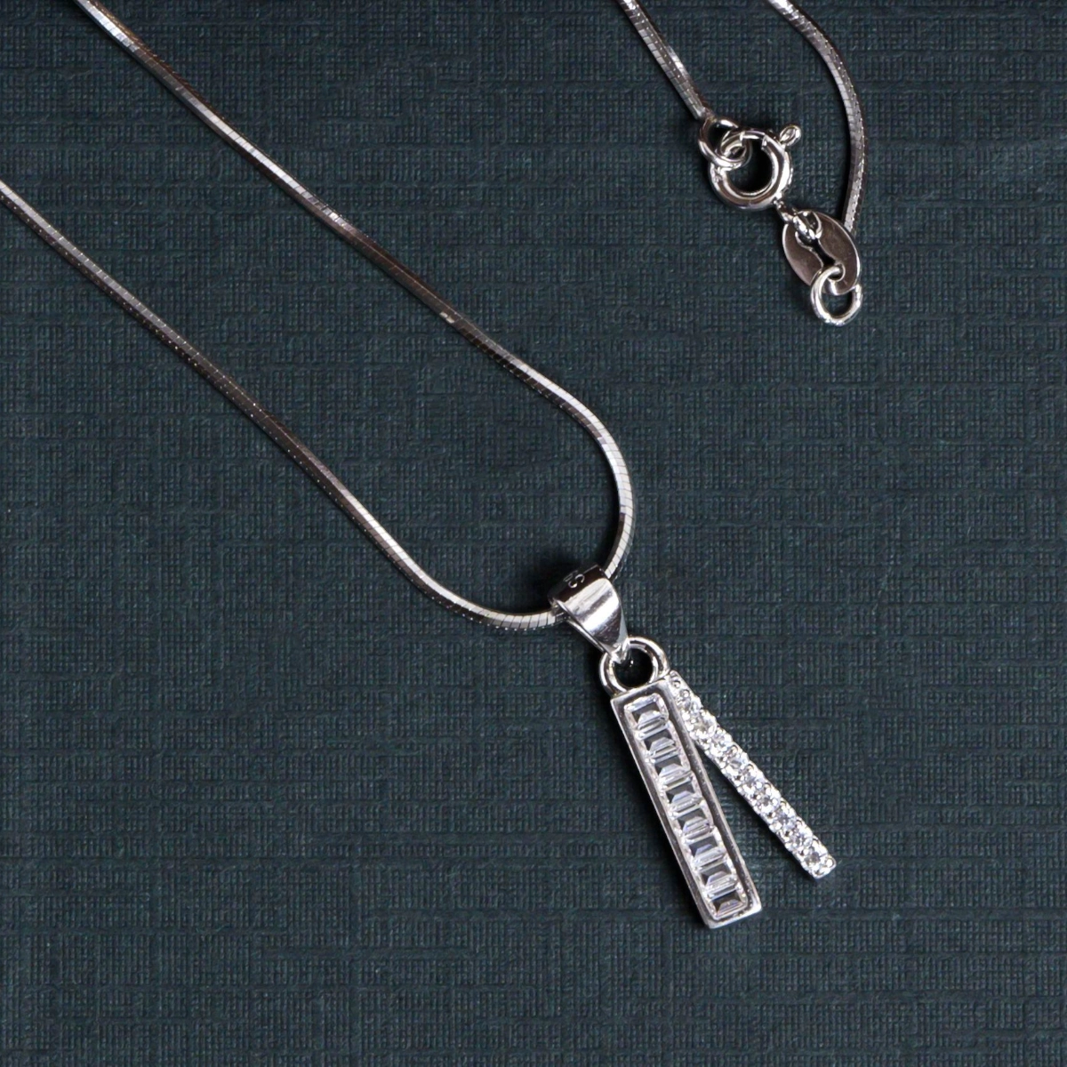 • Necklace: Twin bar pendant on snake chain with secure clasp