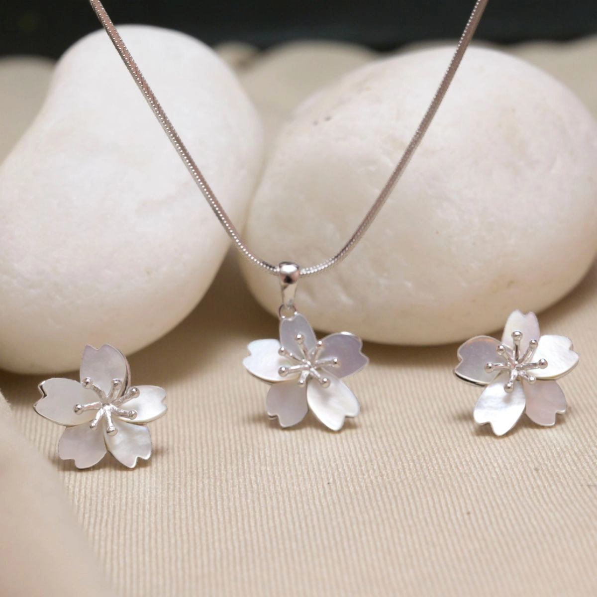 A delicate 925 sterling silver Blossom Petal Pendant set with earrings, featuring hand-crafted mother-of-pearl petals for a soft, natural elegance.