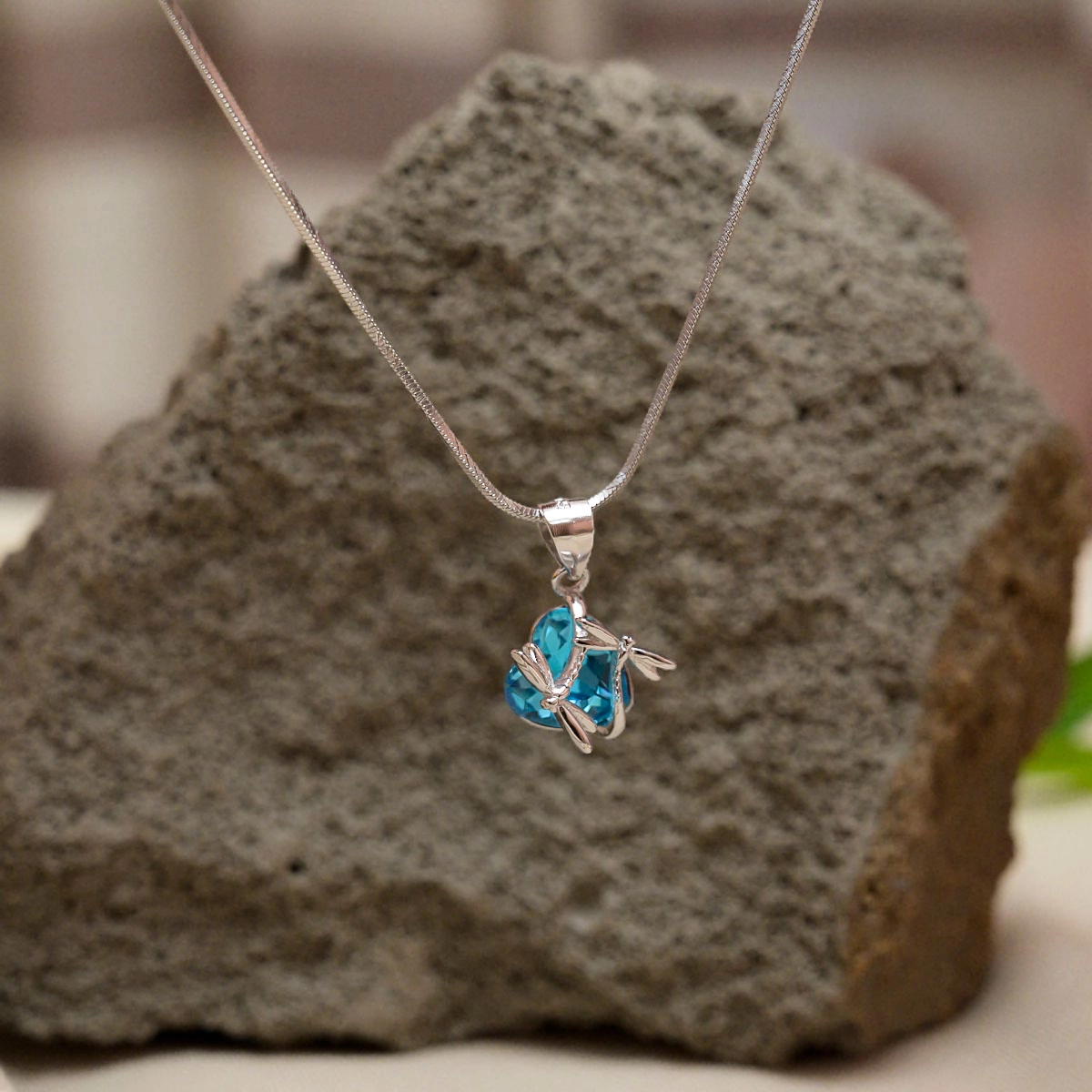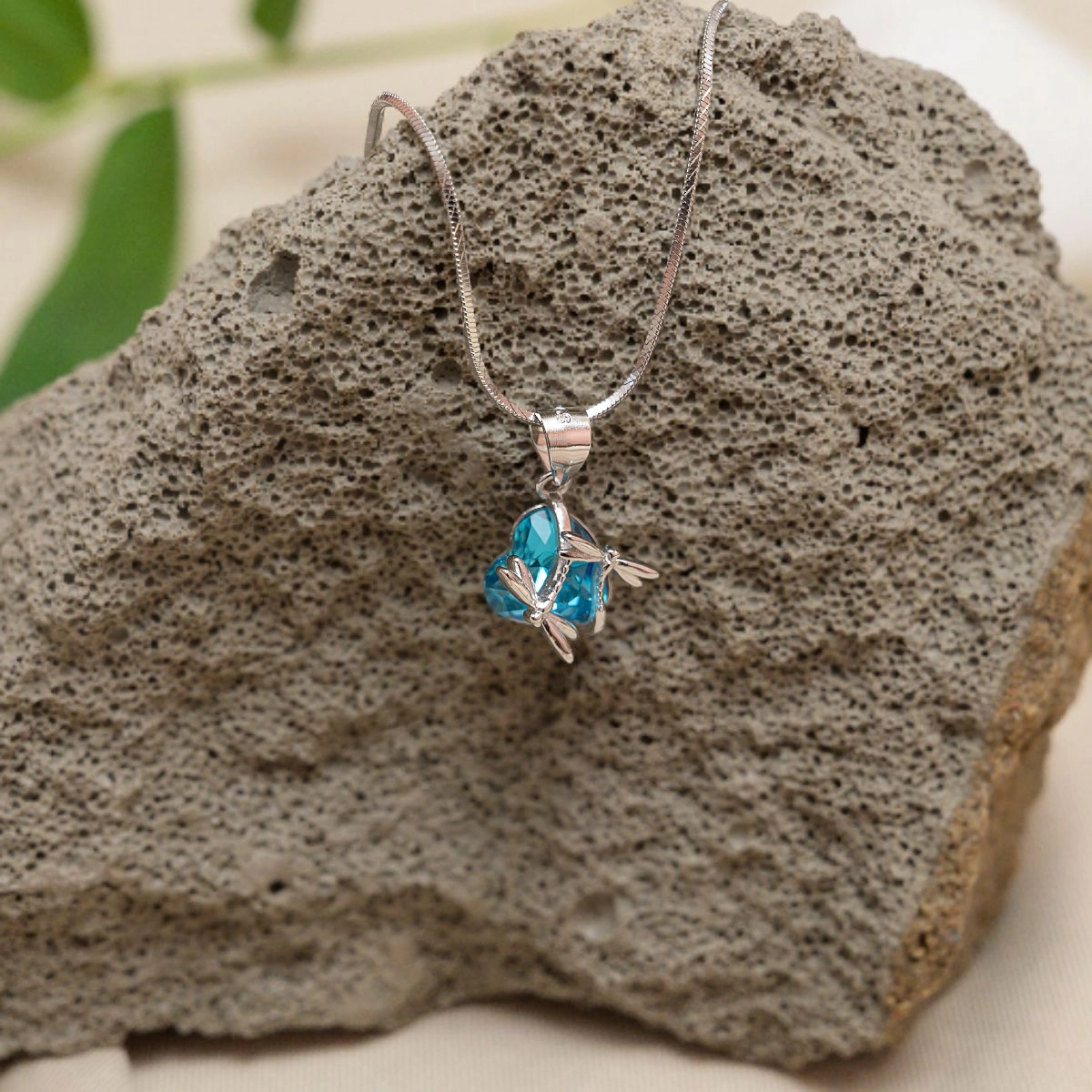 This Blue Heart Dragonfly Pendant Necklace features an enchanting pendant crafted in 925 sterling silver, featuring a radiant blue heart-shaped gemstone embraced by delicate dragonfly accents — a perfect harmony of elegance and nature-inspired beauty, paired with a sleek chain.