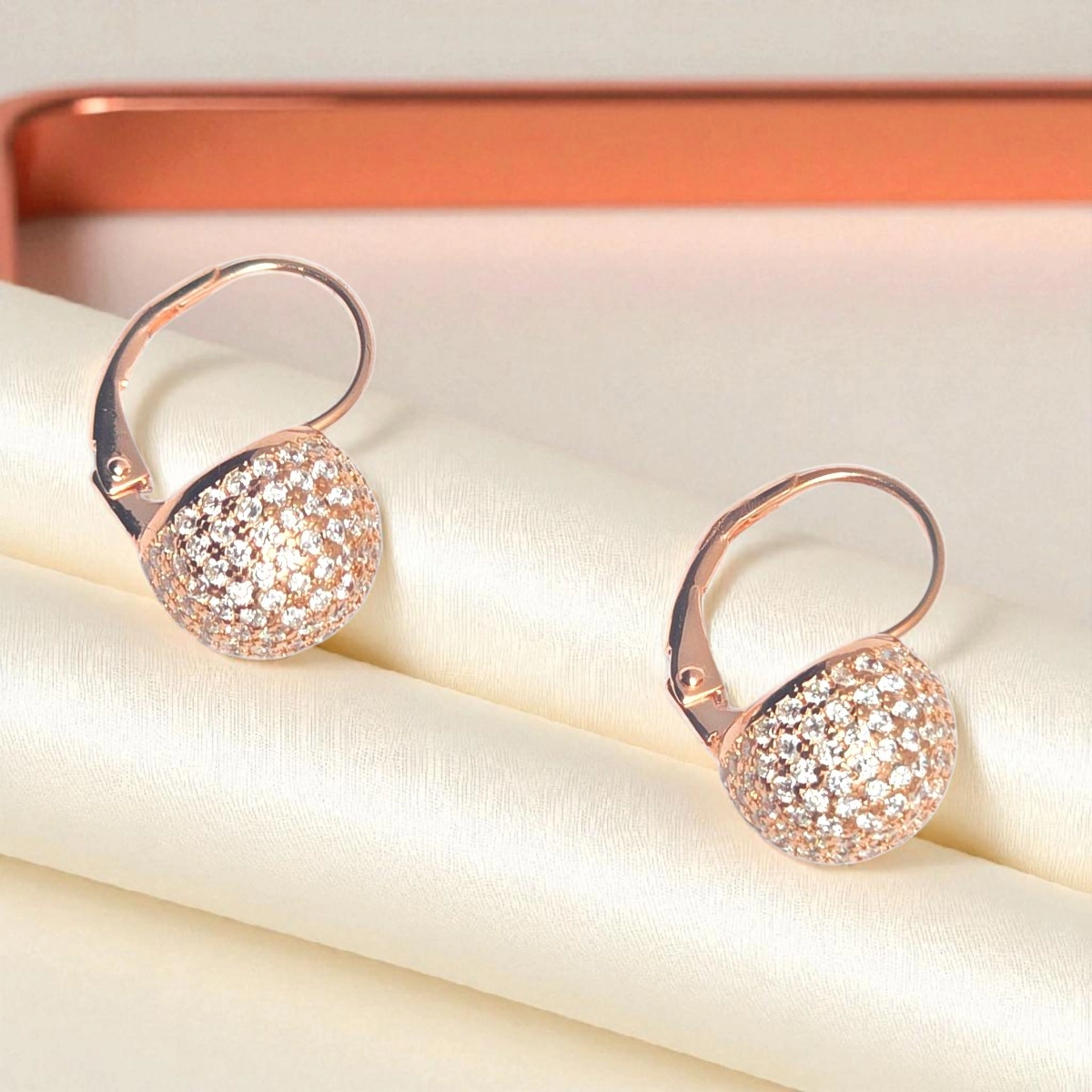 Inspired by celestial geometry and red-carpet elegance, the Blush Orbit Earrings are a luxurious take on minimalist glamour. Crafted from 925 silver with a soft rose gold polish, each earring features a rounded dome pave-set with dozens of shimmering cubic zirconia stones. The clean lever-back closure ensures a secure, elegant drape on the ear while keeping the look lightweight and versatile. Perfectly balanced between classic sparkle and modern design, this pair adds a gleaming pop to any outfit, day or night.
