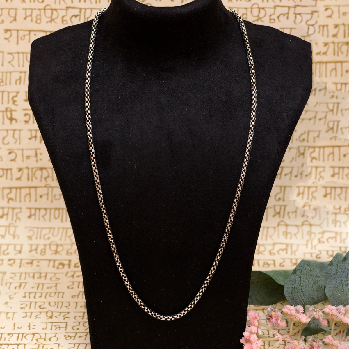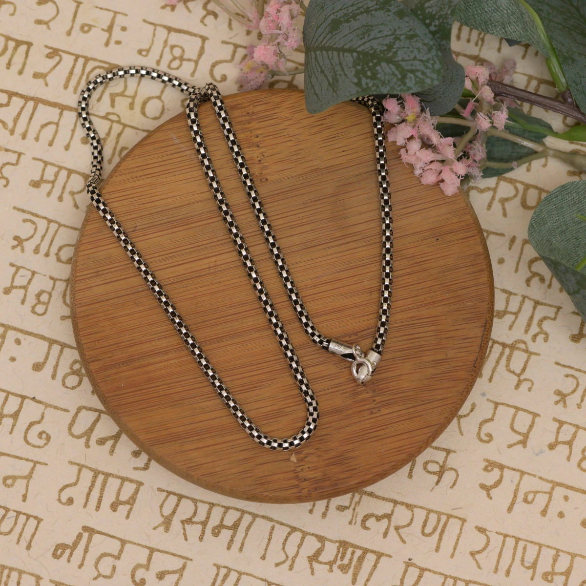 Elevate your everyday look with the Checkered Oxidized Chain, designed in pure 925 sterling silver. Its unique checkered pattern and oxidized finish create a striking contrast, giving it a rugged yet stylish vibe. Sturdy, masculine, and versatile, this chain is perfect to wear solo for a bold statement or paired with pendants for a layered look. Finished with a secure lobster clasp, it offers both durability and comfort, making it an essential piece in every man’s jewellery collection.
