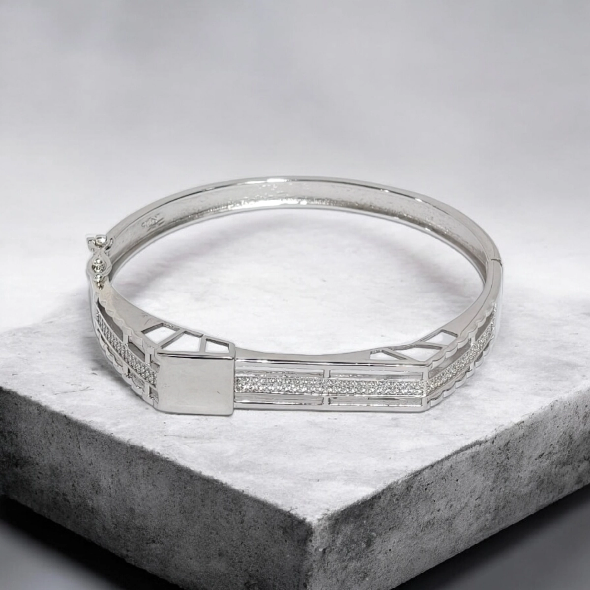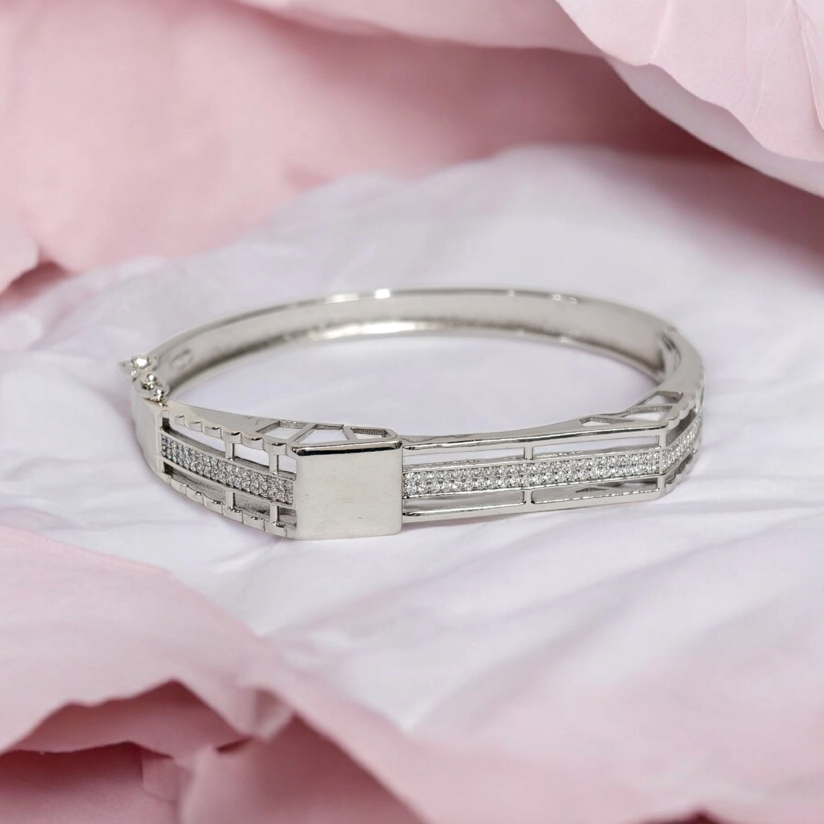 Elevate your wrist game with the Contemporary Silver Dual-Track Bridge Kada, a piece designed for those who love structural elegance. Unlike traditional solid bangles, this design utilizes “negative space” to create a light, airy feel. The silhouette features two parallel tracks of precision-set Cubic Zirconia stones that run along the top, joined in the middle by a bold, unembellished square of high-polished silver. The sides feature a unique “ladder” or grid cutout pattern, giving the piece a technical, architectural vibe that looks interesting from every angle. This dual-track bridge kada balances the brilliance of stones with the cool, understated gleam of plain silver, making it a versatile accessory for the modern minimalist.
