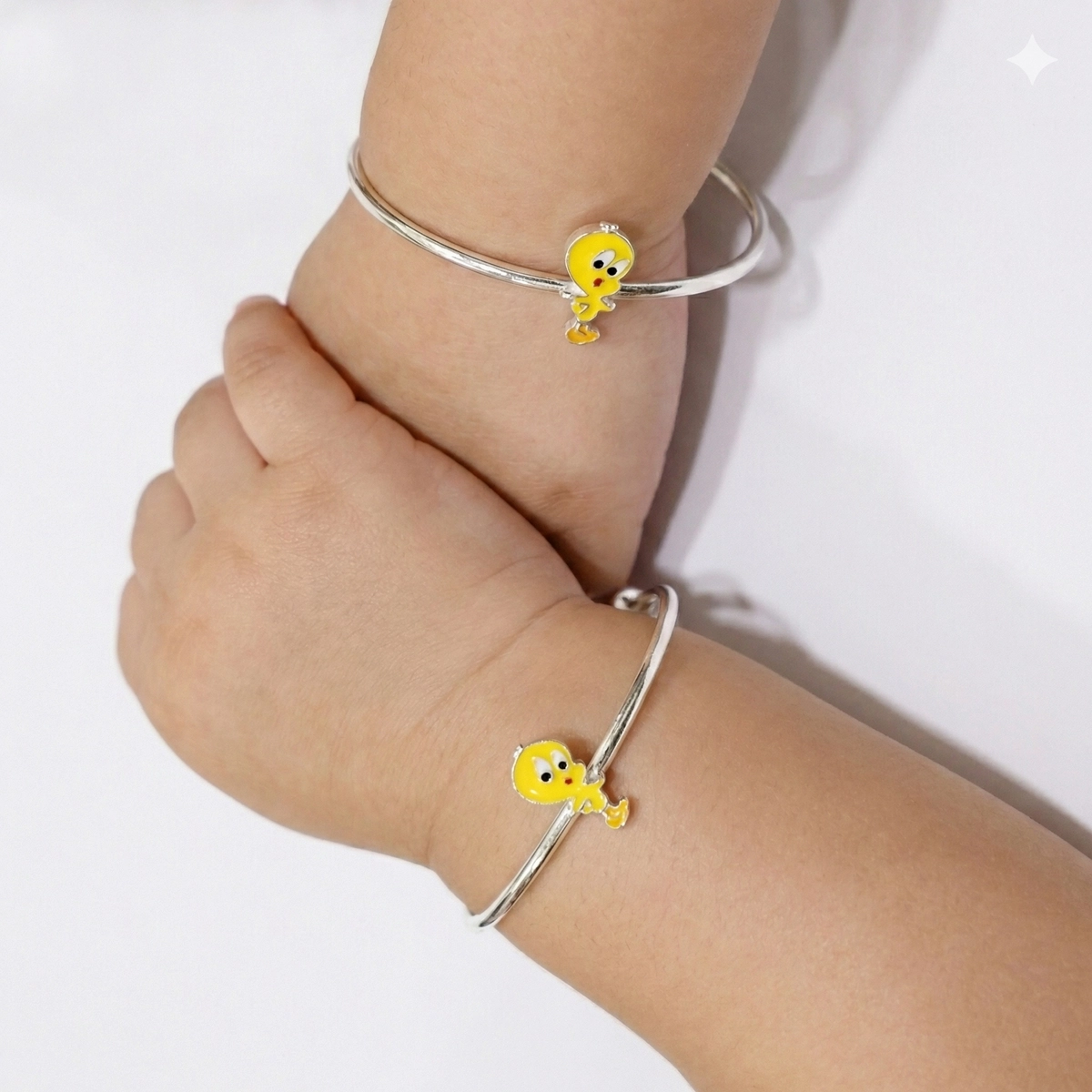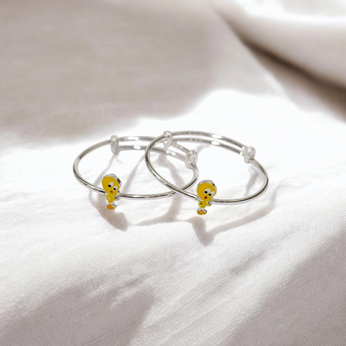 Add a dose of animated fun to your little one’s collection with the Cute Yellow Cartoon Bird Kids Kadali. Perfect for fans of classic cartoons, this pair features a lovable canary character that generations have adored. The focal point is a single, meticulously detailed charm featuring the bird’s signature big blue eyes, bright yellow feathers, and orange feet. Suspended between two polished silver beads on a smooth silver tube, this little bird adds a playful and nostalgic touch. The minimalist design ensures it is lightweight and comfortable, perfect for active kids. Crafted from high-polished 925 Sterling Silver, these yellow cartoon bird kids kadali feature a smart, adjustable sliding mechanism that ensures a perfect fit as your child grows.