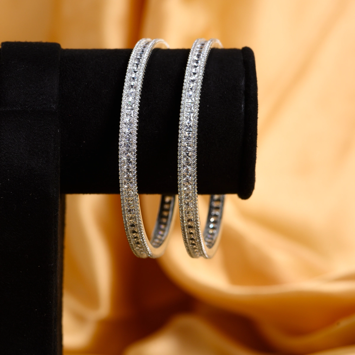 Refined elegance meets timeless sparkle in these CZ Encrusted Sleek Bangles, crafted in 925 sterling silver. Featuring twin rows of precisely set cubic zirconia, these bangles radiate brilliance without being overpowering. Their slim yet sophisticated design makes them perfect for layering with other bangles or wearing solo for a minimal, classy look. From daily wear to festive occasions, they blend seamlessly with every outfit.