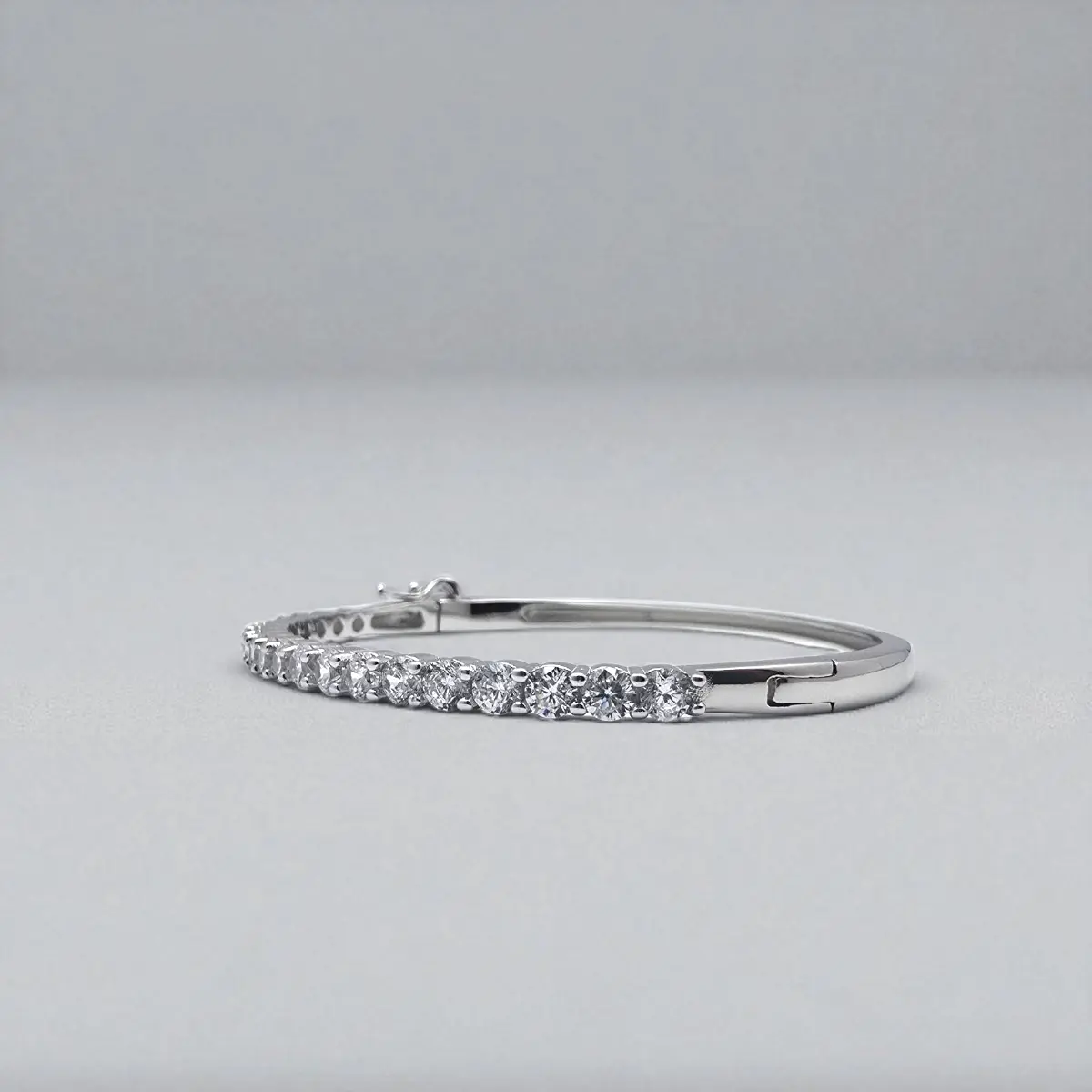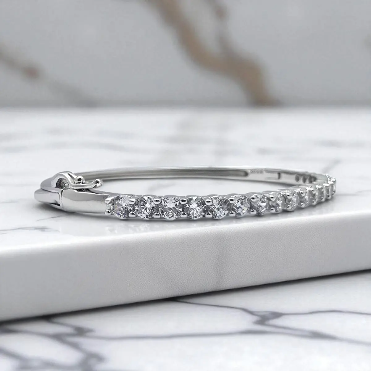 - Design: Full front line of brilliant prong-set CZ solitaires