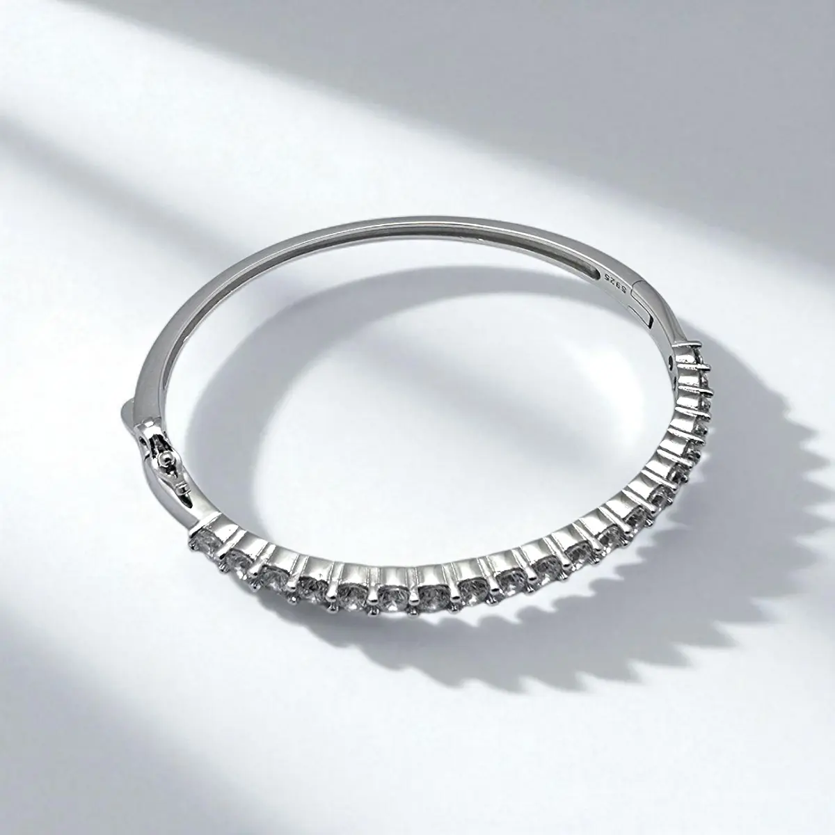Make a luminous statement with this CZ Solitaire Line Kada crafted in pure 925 silver. The front is adorned with a continuous line of brilliant-cut cubic zirconia, each meticulously prong-set to reflect maximum sparkle. Designed with a high-polish white rhodium finish, the kada blends timeless sophistication with everyday luxury. A secure box clasp ensures a snug fit, making it a versatile companion for weddings, evening soirées, or a bold daily look.