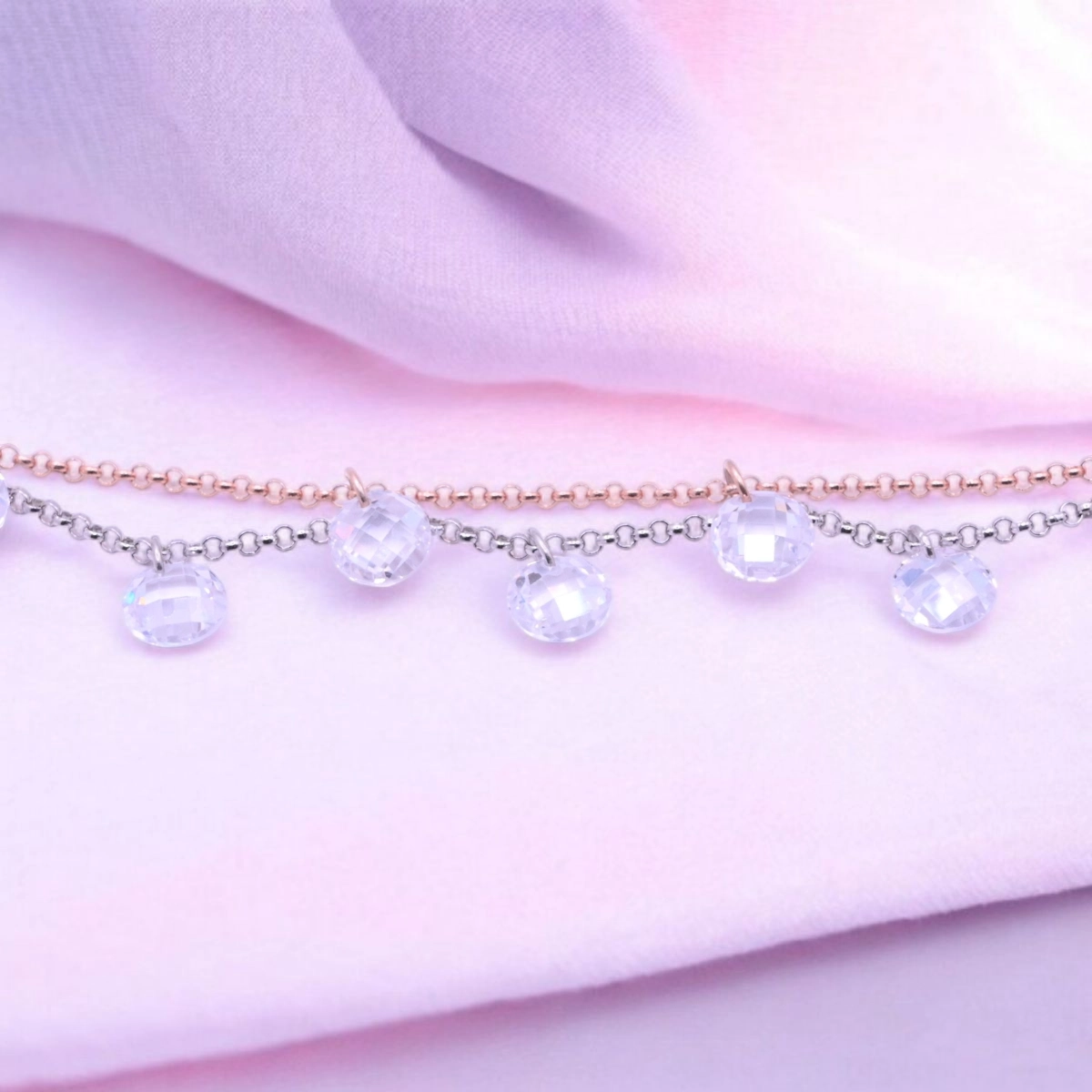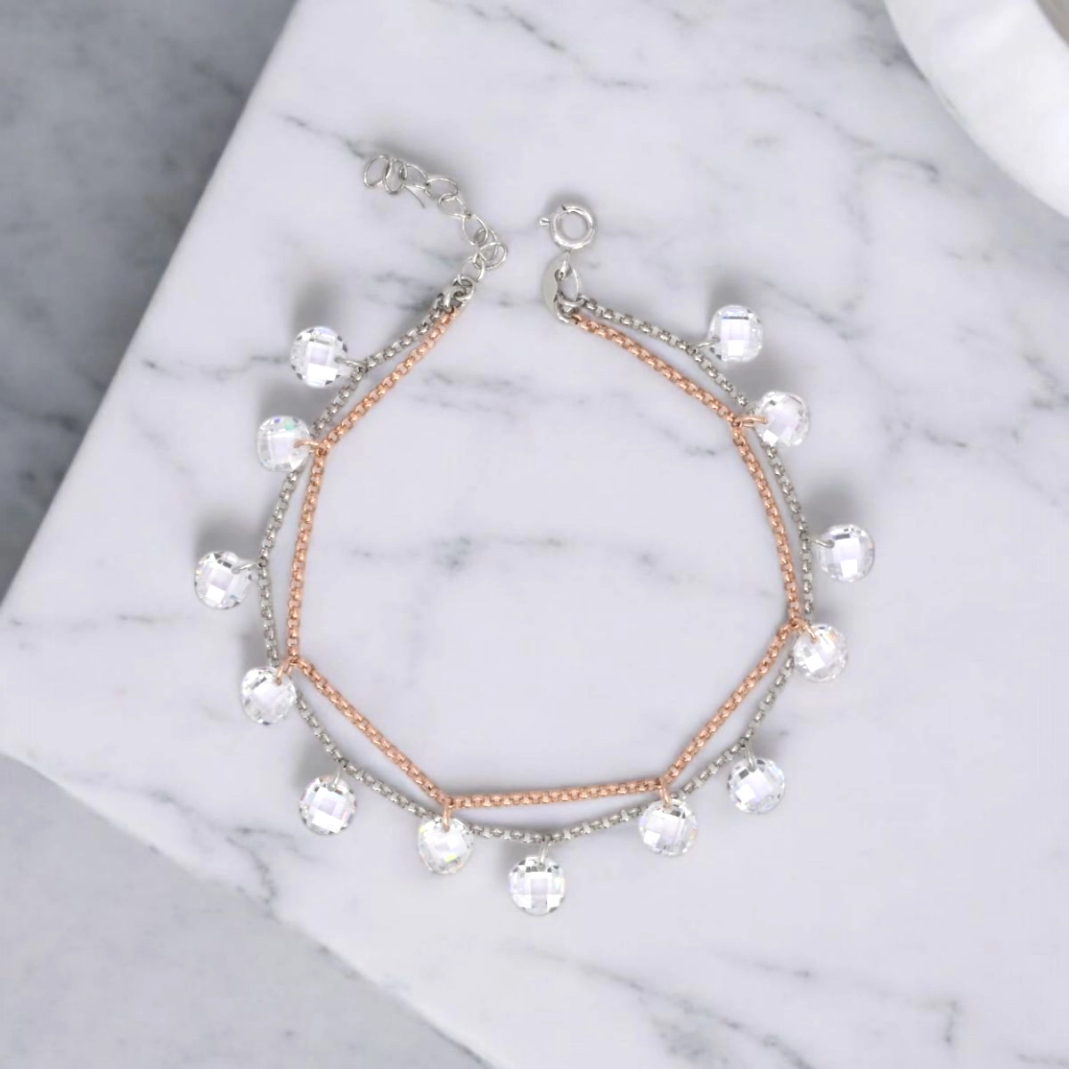 • Design: Two-strand layered bracelet (one silver, one rose gold) with dangling round CZ charms
