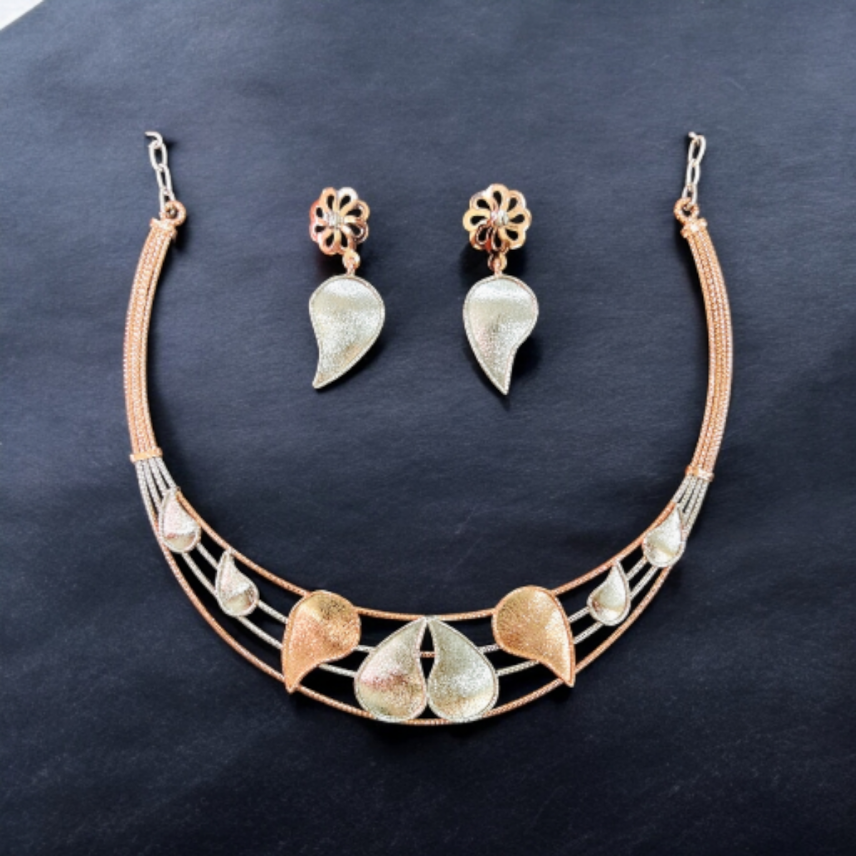 The leaves feature a stunning “frosted” or sandblasted matte texture, alternating between silver and rose gold for a chic visual rhythm. The dual tone cascading leaf necklace set is completed with matching earrings that feature a charming rose gold floral stud and a silver leaf drop, offering a secure and stylish fit.