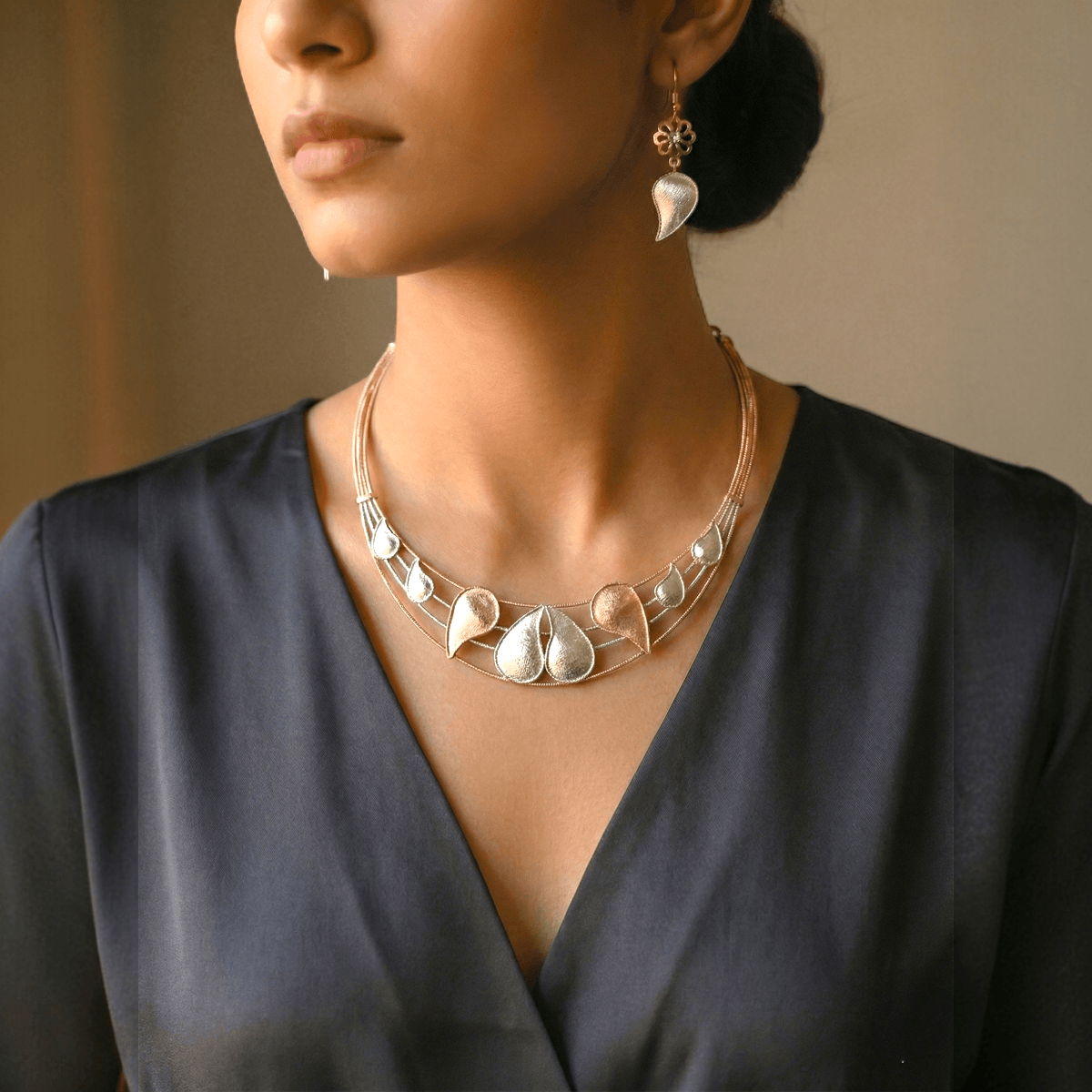 - A Modern Dual Tone Cascading Leaf Necklace Set