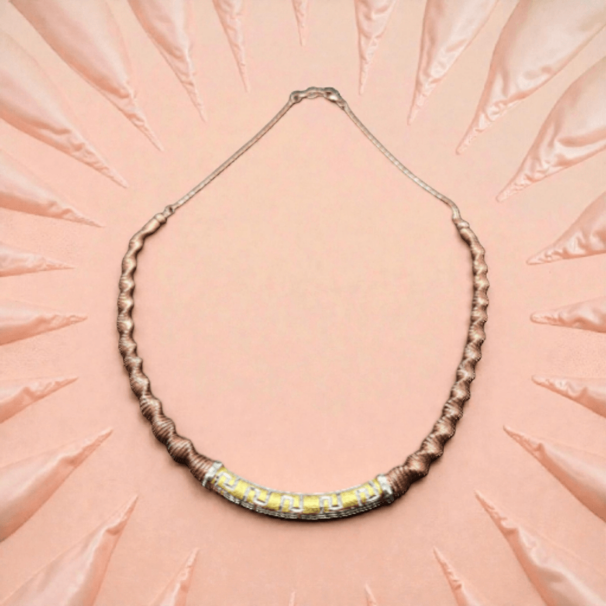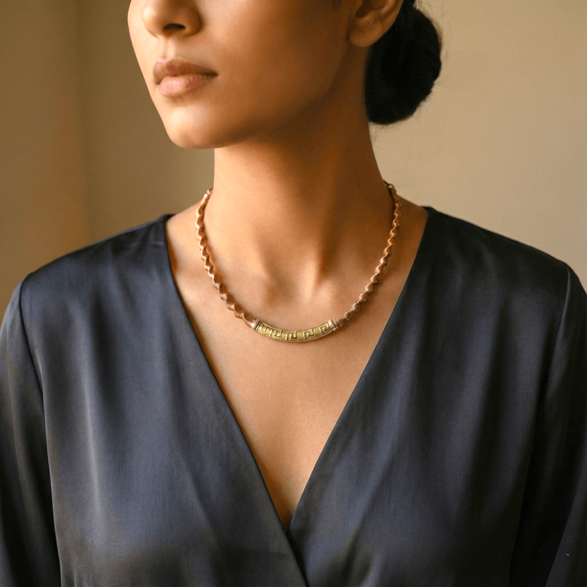 Effortless elegance meets modern design in our Modern Dual-Tone Greek Key Bar Necklace. Designed for the woman on the go, this piece features a sleek, curved tube pendant adorned with the timeless “Greek Key” (Meander) motif—a symbol of infinity and eternal flow. The pendant showcases a sophisticated interplay of colors, with the geometric pattern highlighted in contrasting silver/rhodium against a textured gold background. It is suspended on a stylish, rigid-style twisted rope chain (likely rose gold or copper tone) that sits beautifully around the base of the neck. This Dual-Tone Greek Key Bar Necklace is the perfect accessory to elevate your workwear or add a touch of shine to casual outfits.