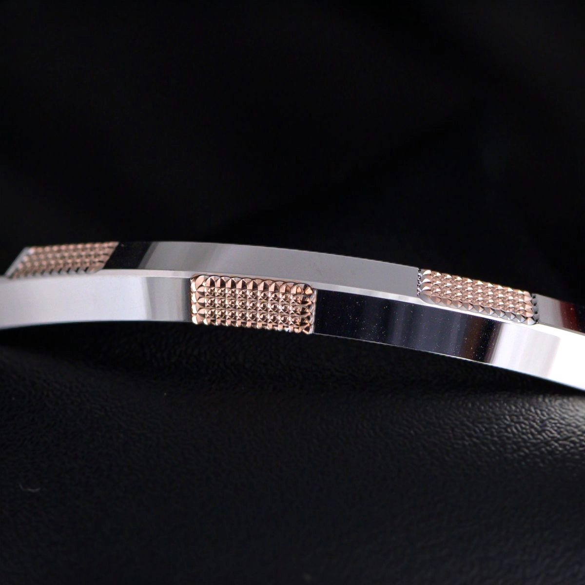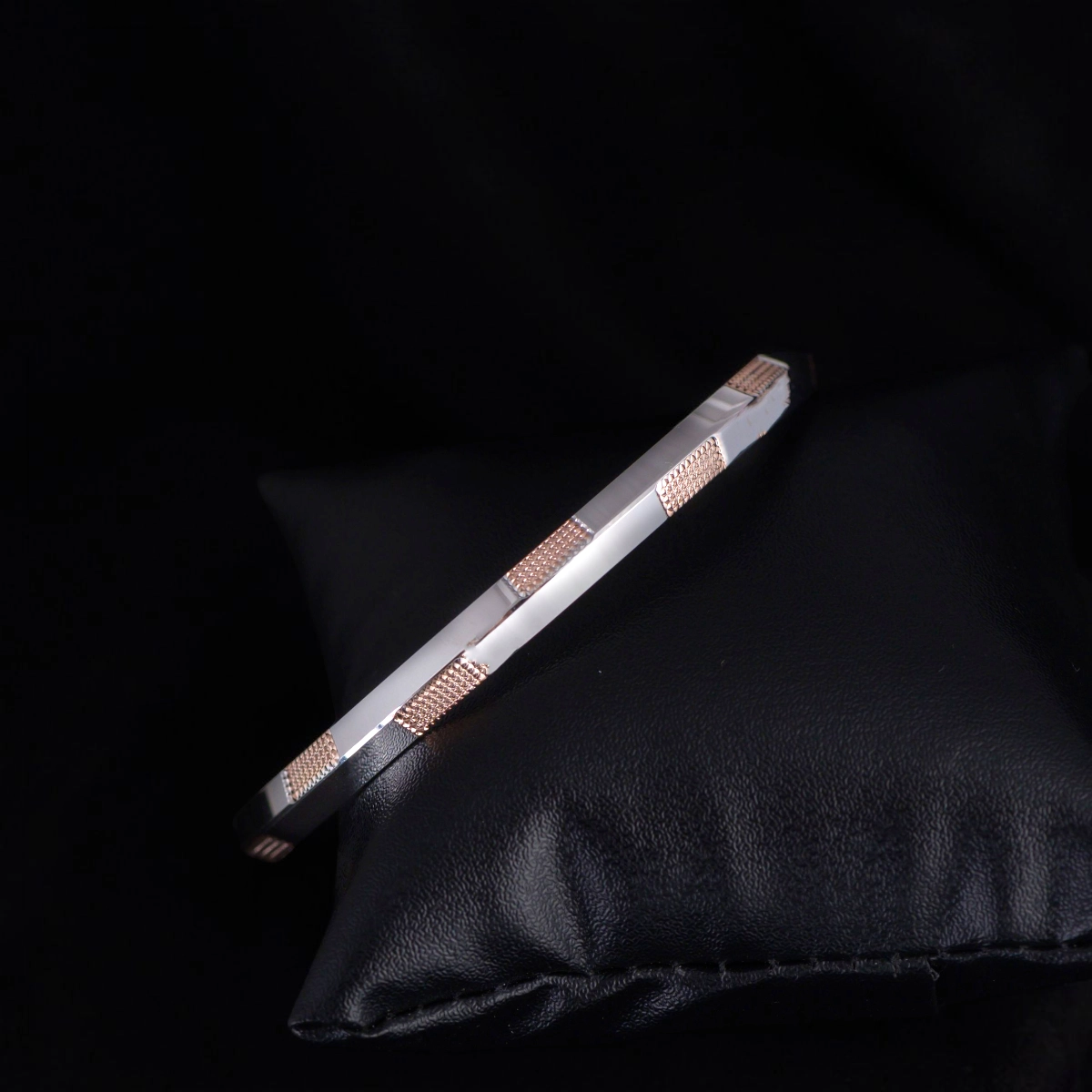 Elevate your accessory game with this 925 Sterling Silver Dual Tone Grid Inlay Kada. The sleek polished silver body is perfectly contrasted with strategically placed rose gold textured blocks, adding both visual interest and a touch of luxury. This design offers a clean, geometric aesthetic that complements both traditional and western attire. Crafted from premium sterling silver, it promises durability, style, and comfort for daily wear or special occasions.