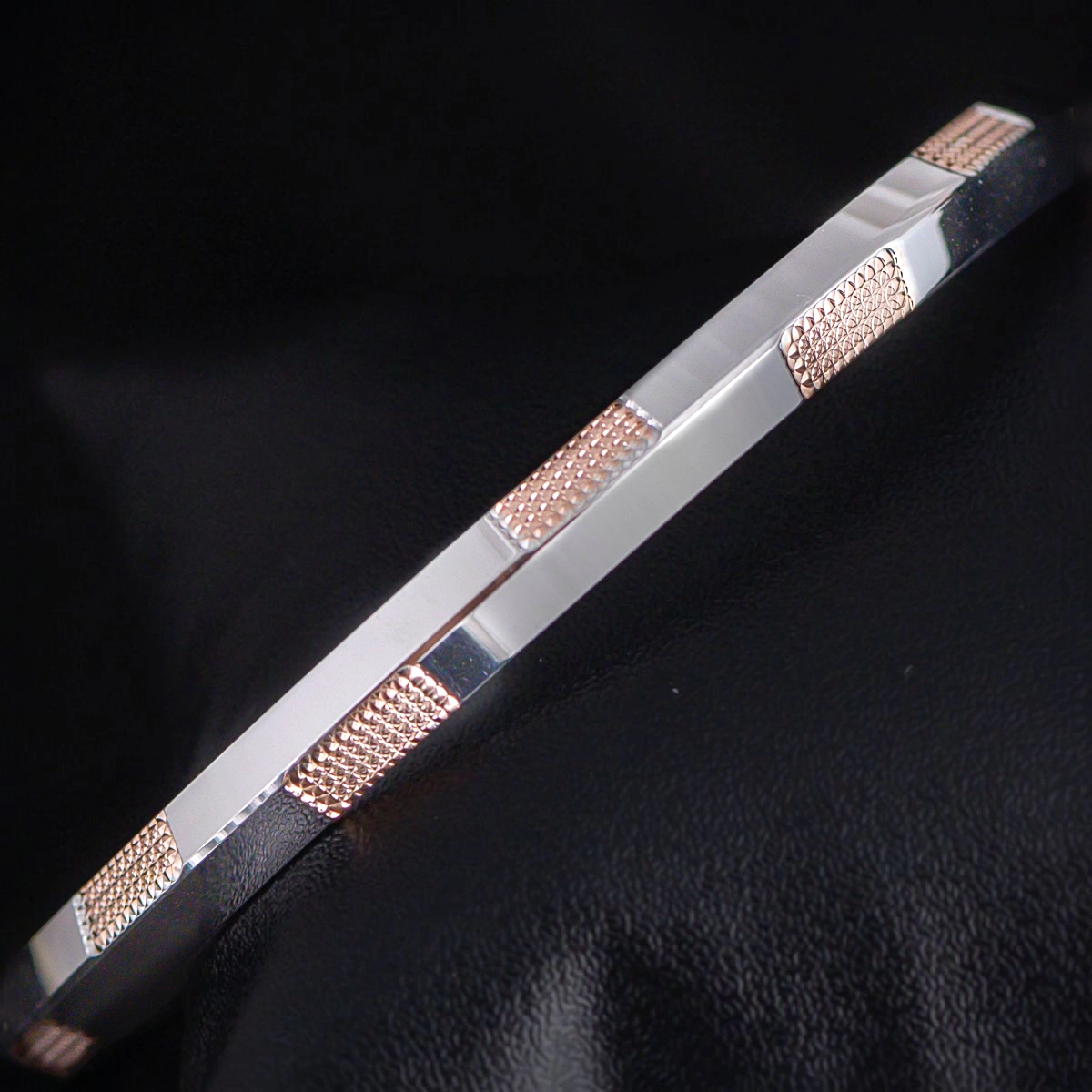 Minimalist yet striking, this 925 sterling silver Dual Tone Grid Inlay Kada features mirror polished faces and rose gold tone grid inlay panels for a refined, modern masculine look.