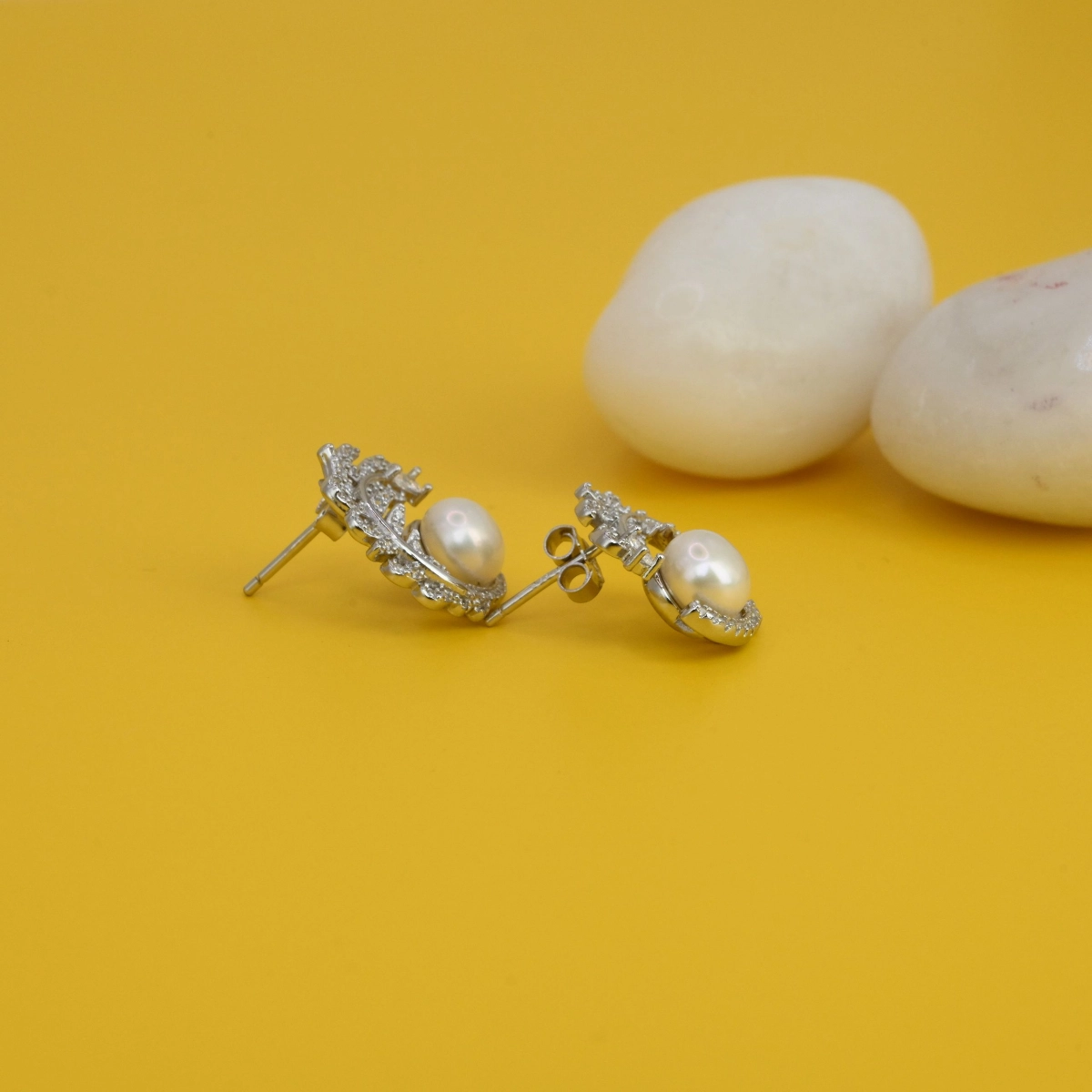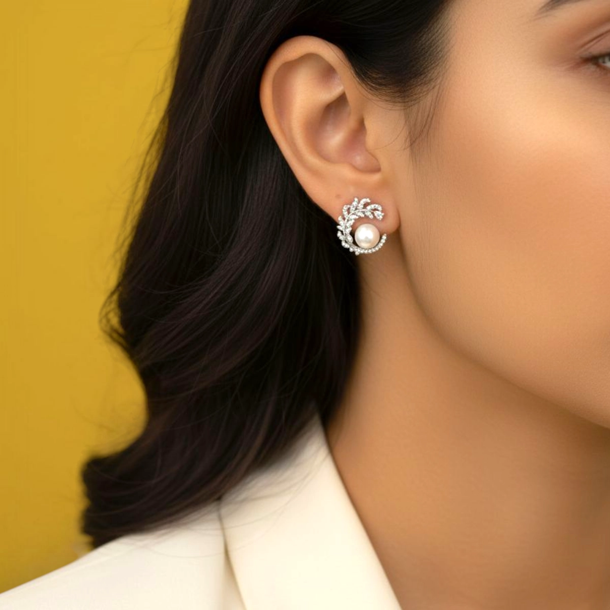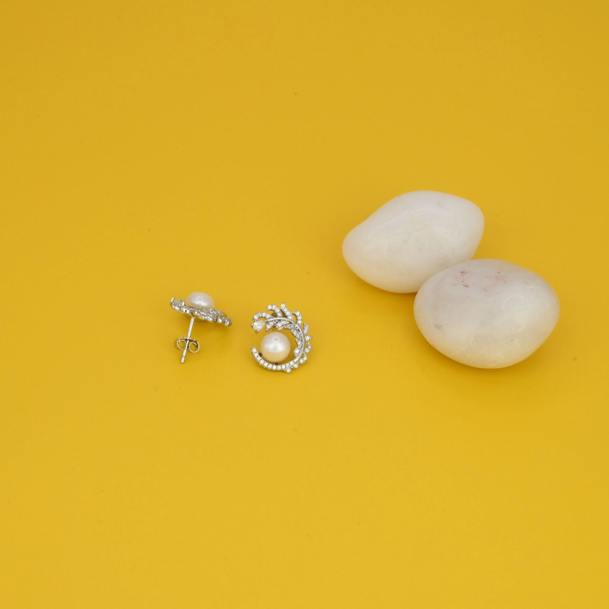 - Design: Stud earring with a central pearl framed by a swirling CZ pave accent