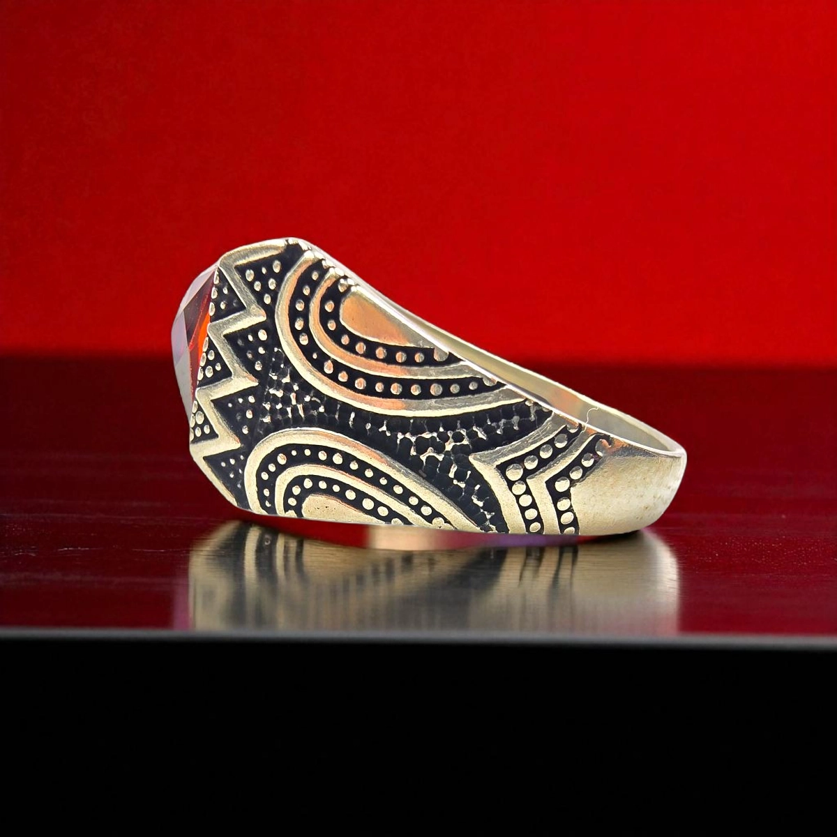 This Ember Crest Ring features a fierce square-cut orange stone framed in tribal engraved 925 sterling silver – a bold fusion of fire and heritage.