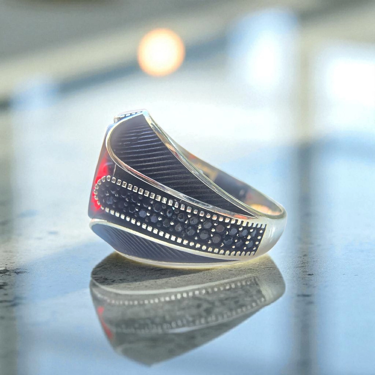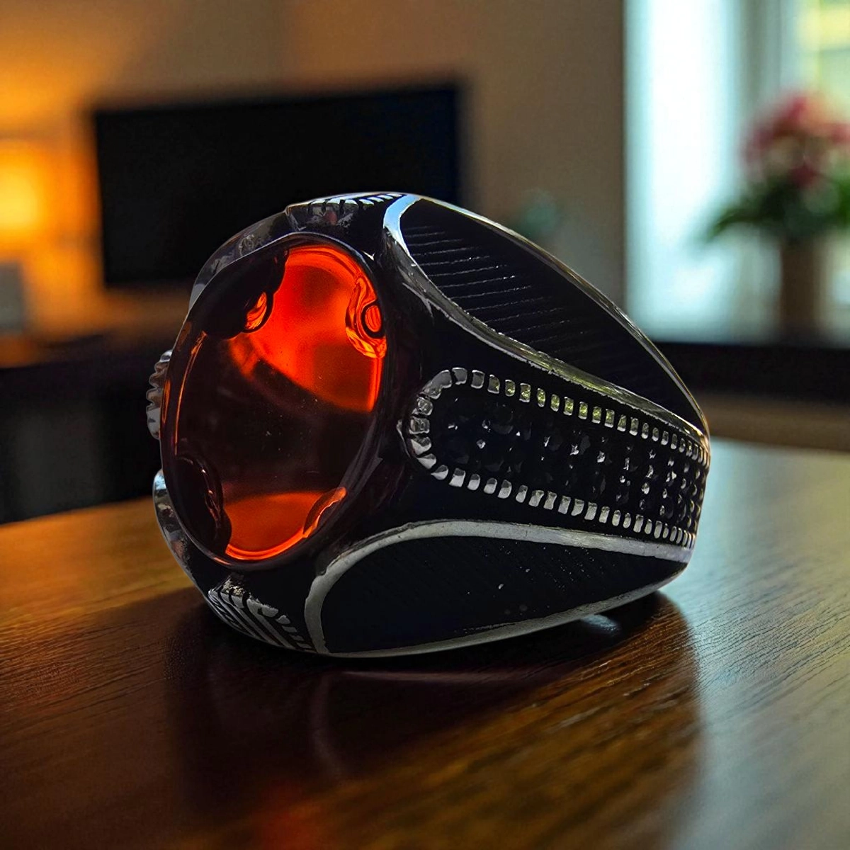 The 925 Ember Shield Ring is a tribute to fearless energy and timeless masculinity. At its heart lies a striking, oval-shaped deep transparent red stone — smooth, glossy, and full of fire. The silver body is intricately carved with bold textures and ridged flanks, evoking the design of ancient armor. Its hefty build, dramatic curves, and powerful color combination make it a standout piece for the man who commands presence. Perfect for vintage lovers, warriors at heart, or anyone wanting a signature piece with old-soul heat.