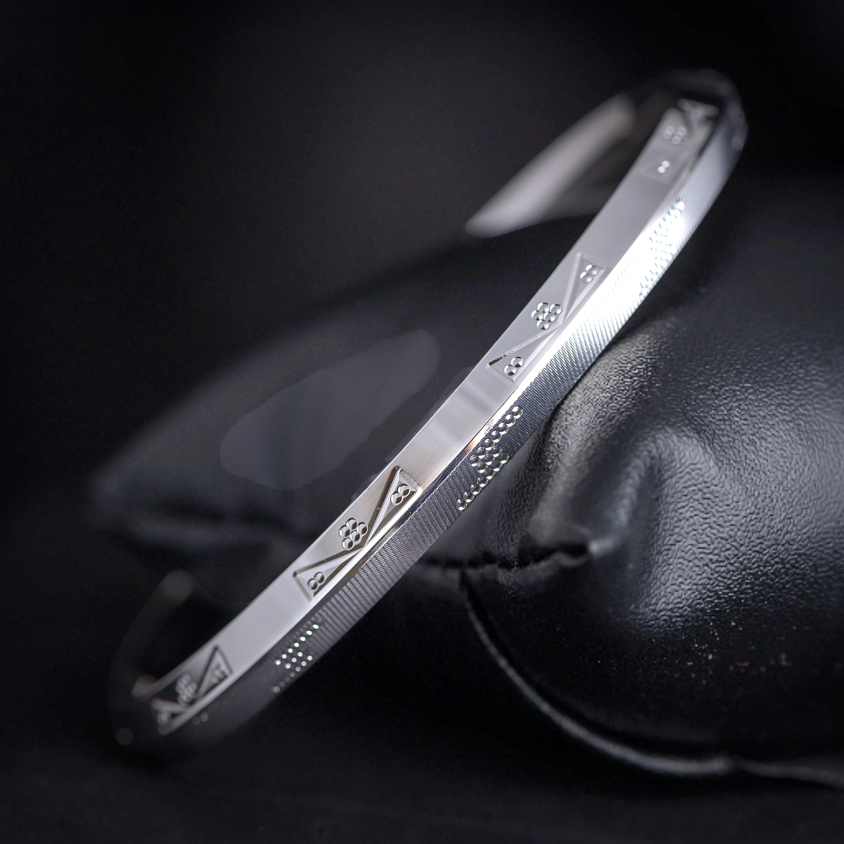 This Etched Triangle Pattern Kada is a high polish sterling silver men’s kada with sleek linear grooves, dotted accents, and repeating triangle motifs along the edge — modern, refined, and available in sizes 2–10.