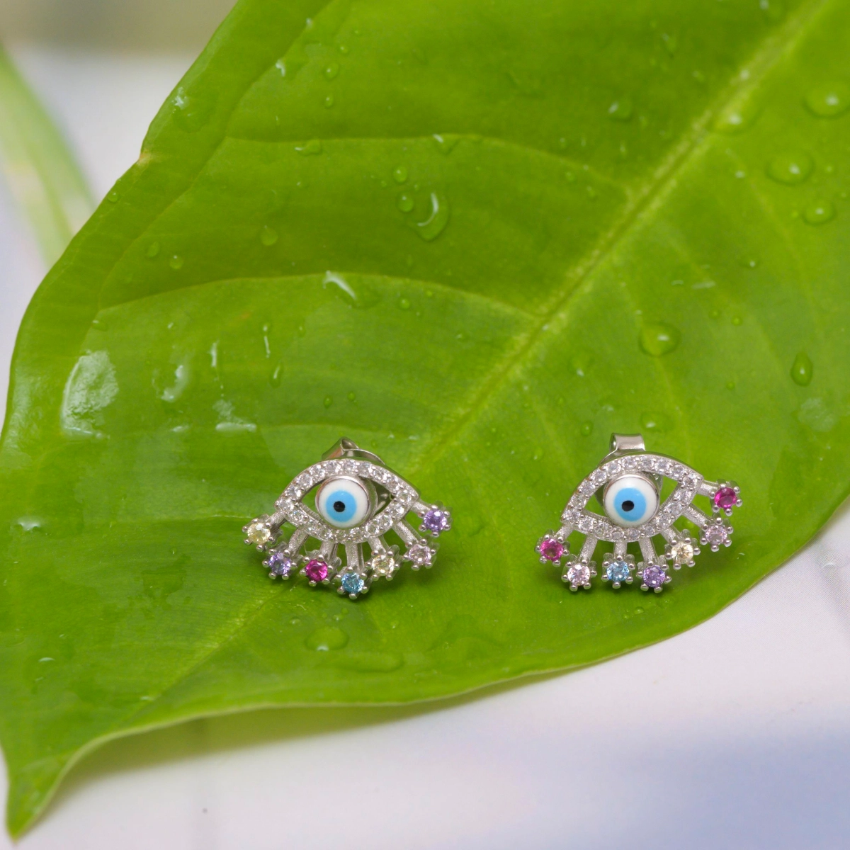 Ward off negativity in style with these 925 silver Evil Eye CZ stud earrings, adorned with dazzling multi-color CZ stones for a vibrant yet protective charm.