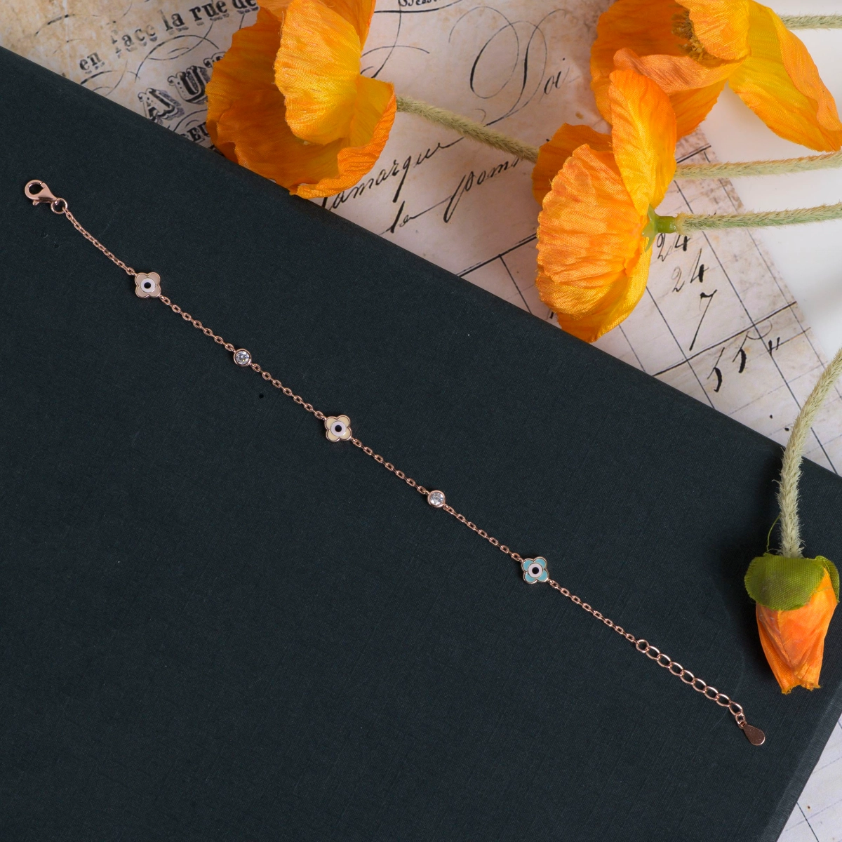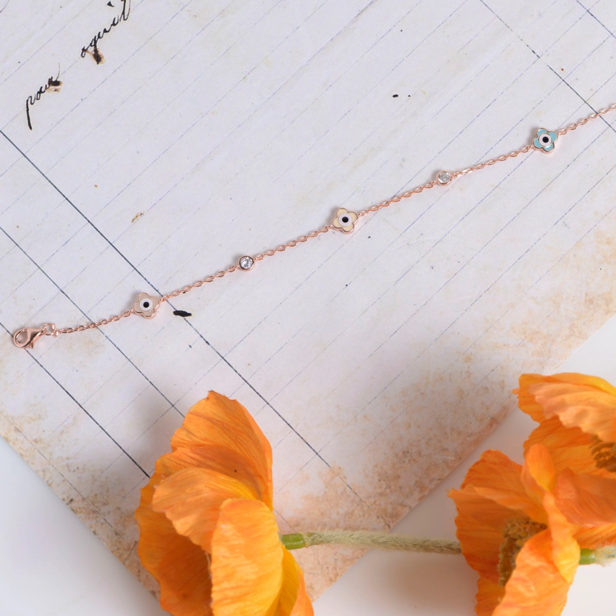 This Floral Evil Eye Bracelet is a delicate bracelet in 925 sterling silver with rose gold plating, featuring floral evil eye charms and sparkling CZ stones for a blend of elegance, meaning, and protection.