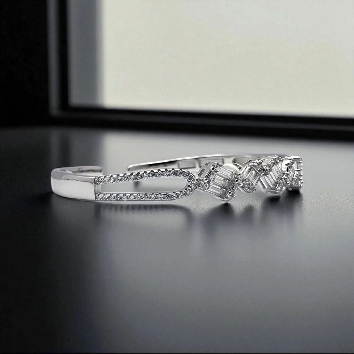 Some pieces don’t just accessorize, they set the mood. Our 925 Silver Geo-Duet CZ Bracelet pairs an ultra-smooth cuff with a choreographed row of mixed-cut stones—baguettes, pears, and rounds—framed by delicate pavé. The open silhouette hugs the wrist comfortably while keeping the look refined and runway-chic. It’s the bracelet you reach for when you want compliments without trying too hard.