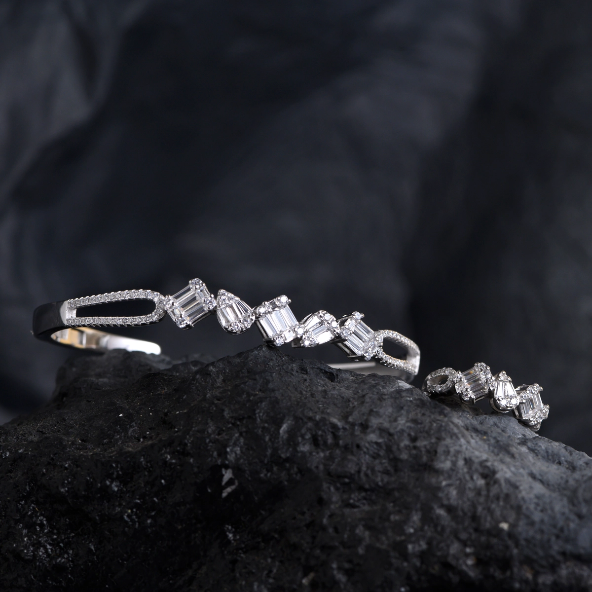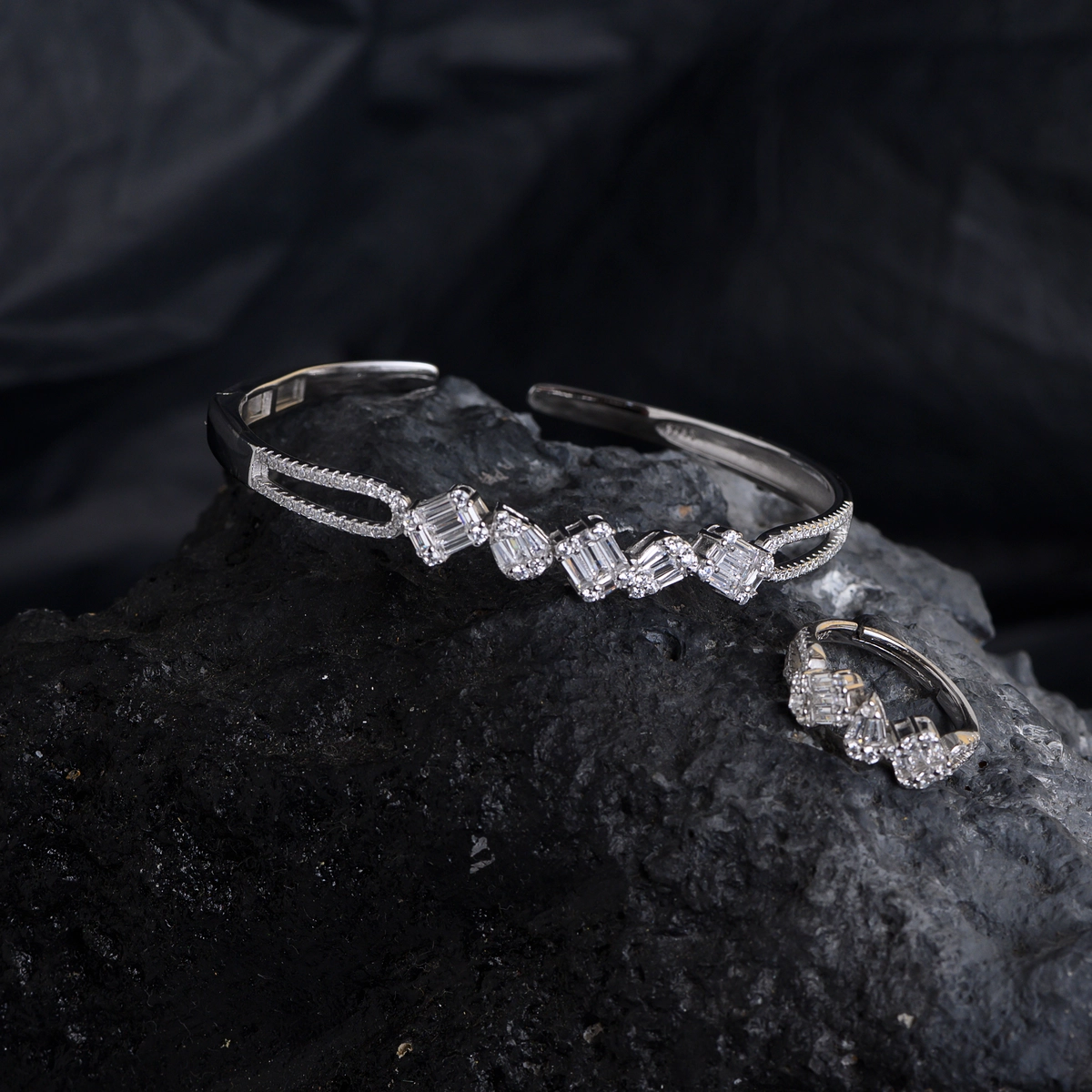 When the details align, getting dressed gets easy. Our Geo-Duet Set unites the open cuff bracelet and sculpted ring, both lined with baguette, pear, and round-cut CZ for a refined play of light. Crafted in 925 sterling silver and finished with rhodium, this Geo-Duet CZ Set is the set you’ll wear on repeat—together for a statement, or separately for subtle sparkle. Perfect for self-treats and even better for gifting.