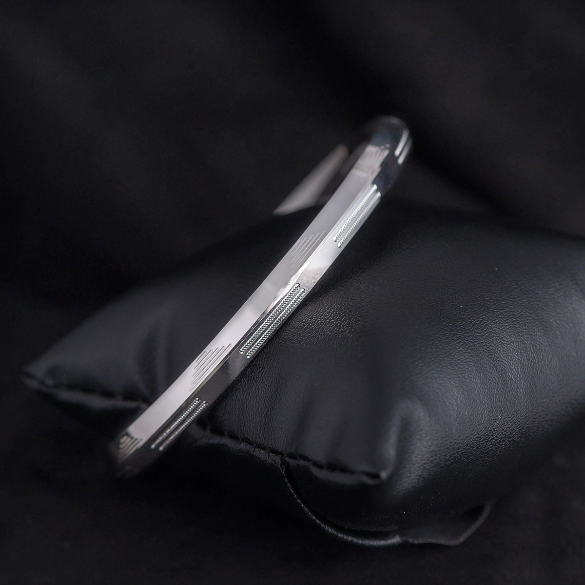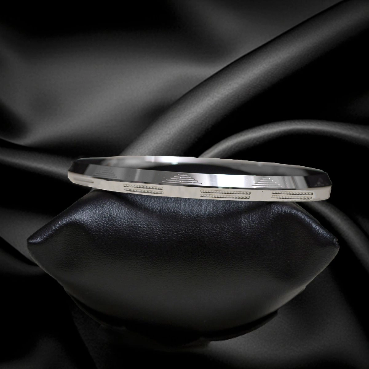 Engineered for the man who values understated sophistication, this gents Grooved Edge Kada is crafted from premium 925 sterling silver with a mirror-polished finish. The outer edge features a geometric faceted cut for a bold profile, complemented by fine linear engraving for subtle texture. Its minimal yet powerful design makes it perfect for both work and casual wear, while the solid silver construction ensures lasting durability. Whether worn solo or stacked, this kada is a mark of refined masculinity.