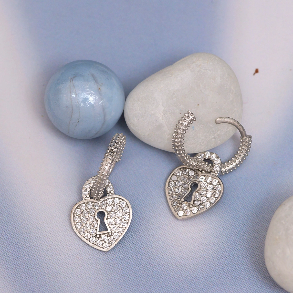 Unlock your style with these charming sterling silver Heart and Keyhole Earrings, featuring a sparkling pave-set heart lock and a matching key drop, symbolizing love and connection.