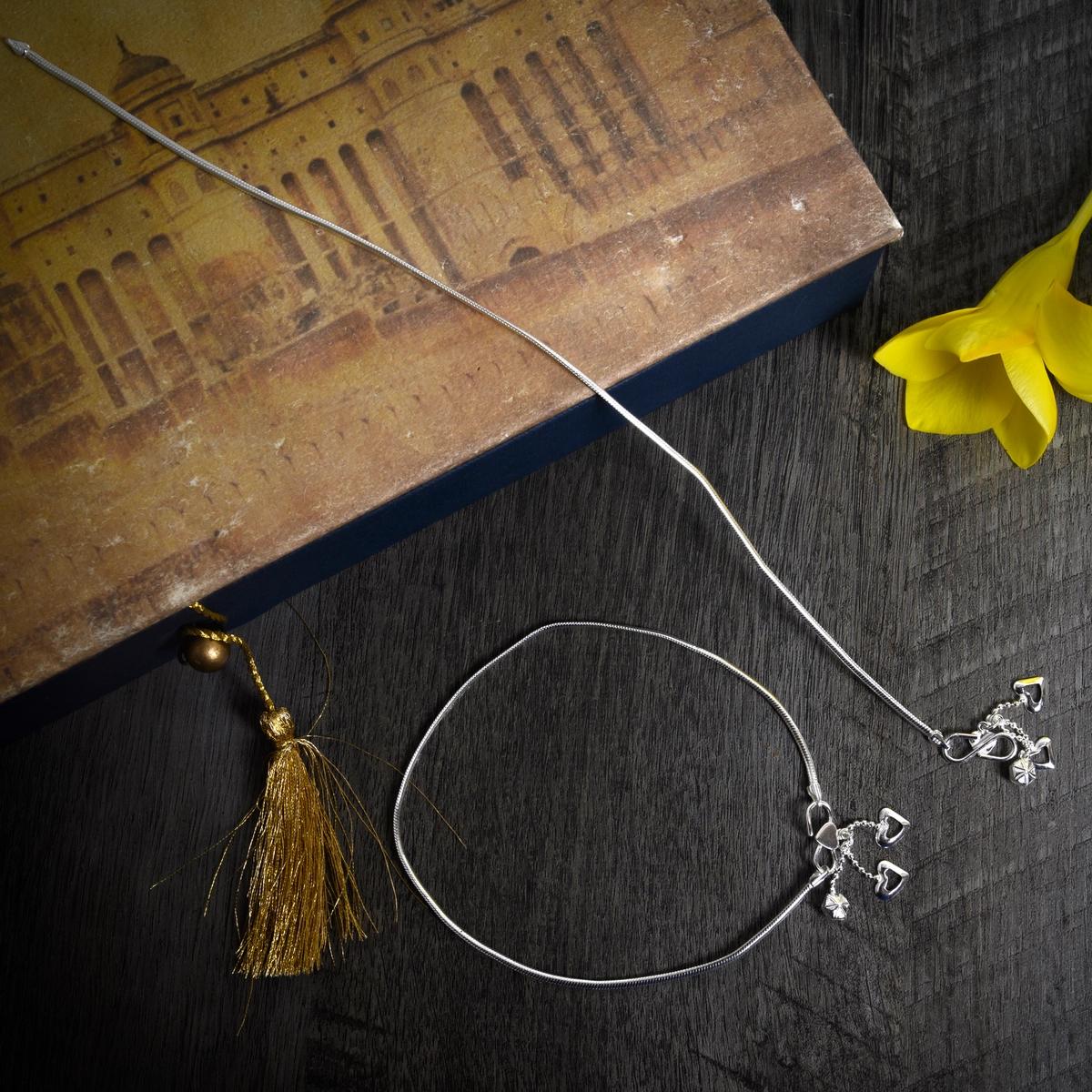 Celebrate tradition with a modern twist with these 925 Silver Heart Charm Anklets. Designed with slender snake chains for a smooth finish, each anklet is detailed with dangling heart charms and tiny silver accents that sway beautifully with movement. Crafted in sterling silver, these anklets bring together minimal elegance and festive charm, making them perfect for both everyday wear and special occasions.