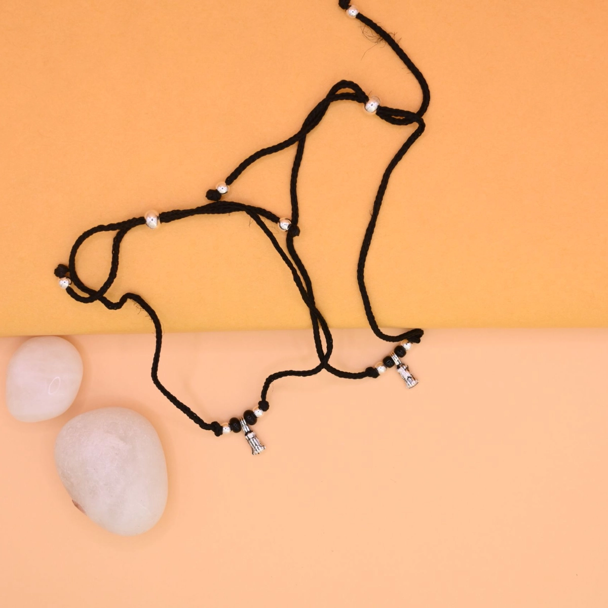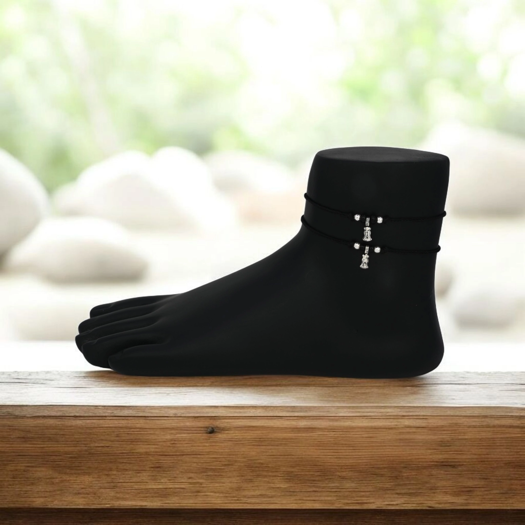 - Design: Adjustable black thread anklet with a central silver Jhumki charm and pearl accents