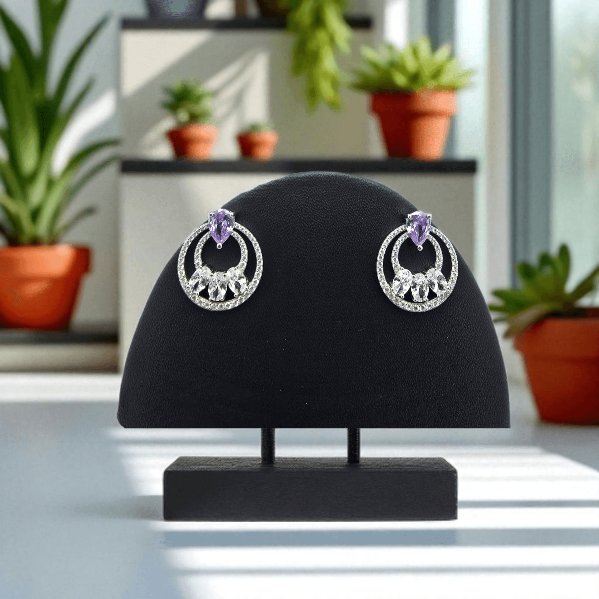 Designed to dazzle with every angle, the 925 silver Lilac Orbit Studs offer a cosmic-inspired silhouette featuring dual silver circles studded with micro CZs. At the top rests a striking lilac-purple teardrop stone, delicately held above a fan-like array of clear marquise-cut CZs. This elegant play of geometry and soft color is perfect for festive evenings, formal dressing, or as a modern heirloom in your collection.