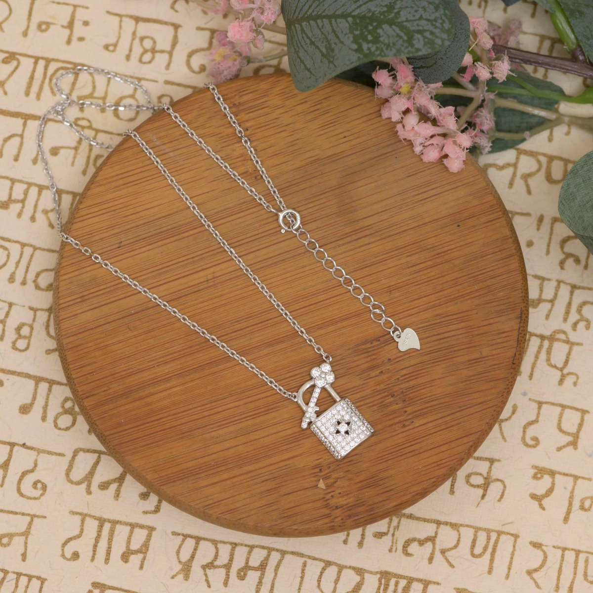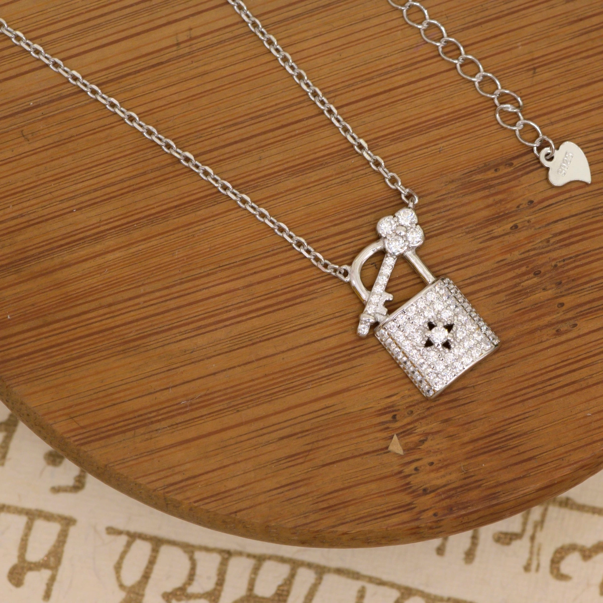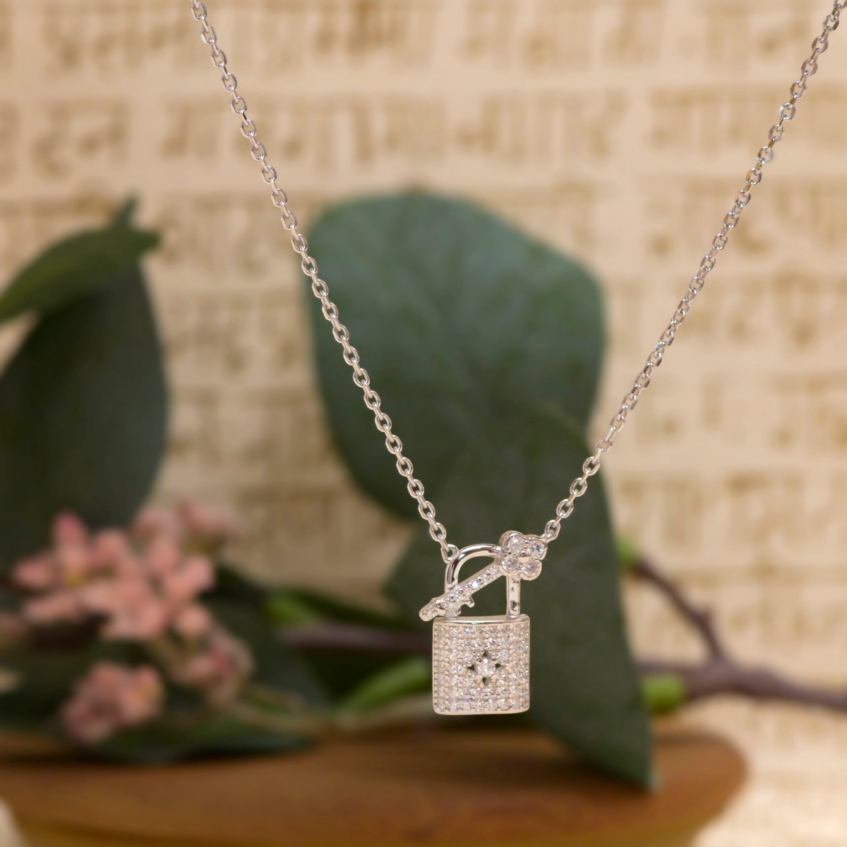 This Lock and Key Necklace is a meaningful sterling silver necklace featuring a pavé-set padlock and petite key charm on an adjustable fine chain—sleek symbolism with everyday sparkle.