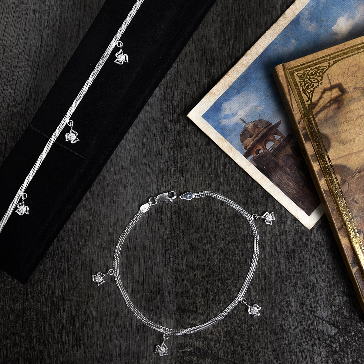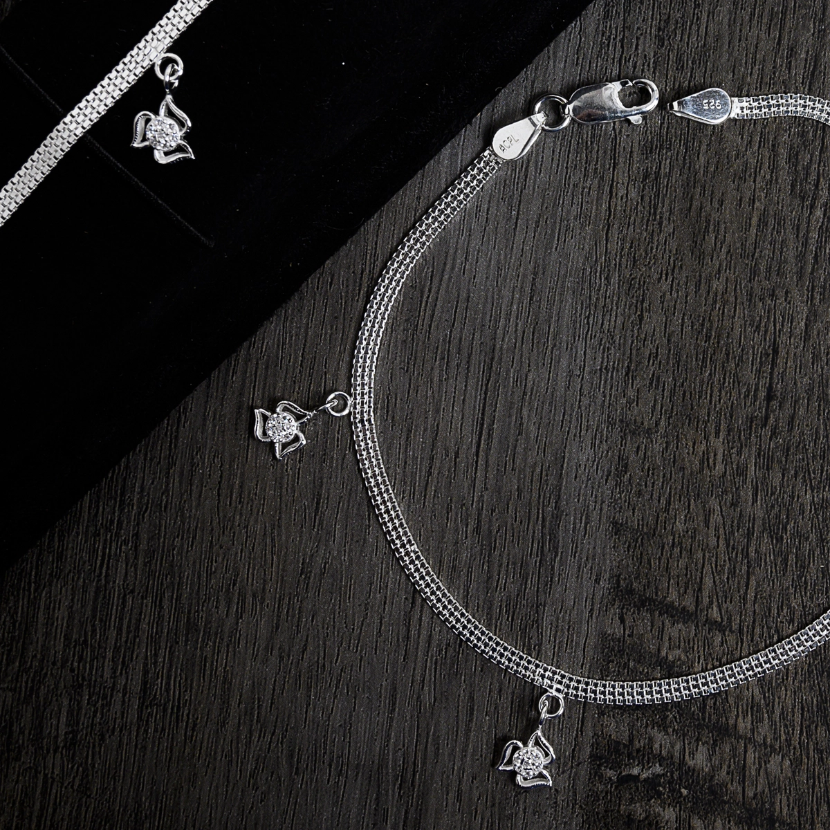 Lotus Charm Anklets – Dual Mesh 925 Silver with Dangling Accents