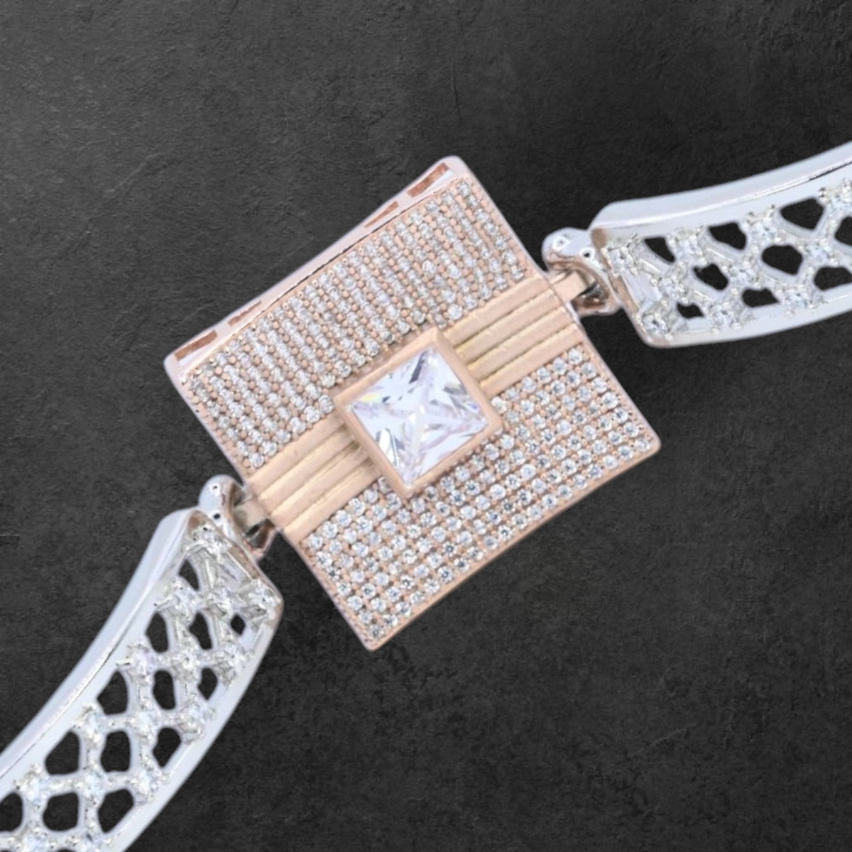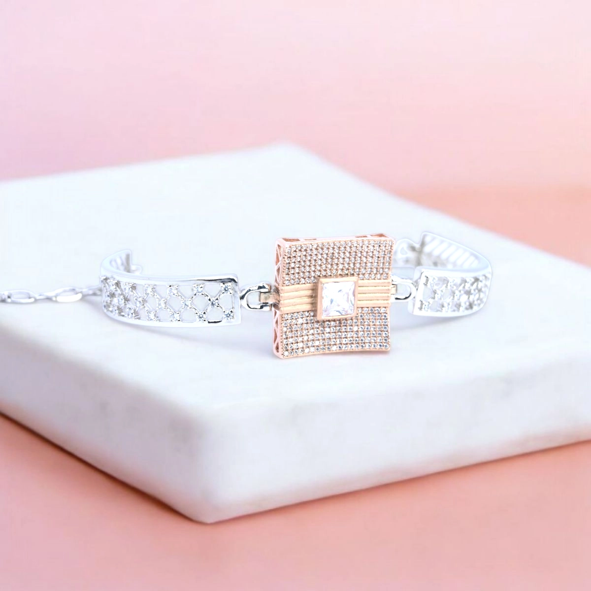 Our Luxe Dual-Tone Geometric Plaque Bracelet is a masterpiece of modern design, crafted for a bold, high-fashion statement. This bracelet is defined by its striking contrasts, blending the warmth of rose gold with the brilliance of silver. The centerpiece is a substantial, rectangular plaque with a rich rose gold polish, completely blanketed in micro-pave CZ stones and centered by a large, princess-cut solitaire. This dazzling plaque is connected to wide, silver bands that feature an intricate, openwork lattice design, which is also set with tiny CZs for continuous, breathtaking sparkle. This is a true statement piece for the festive season.