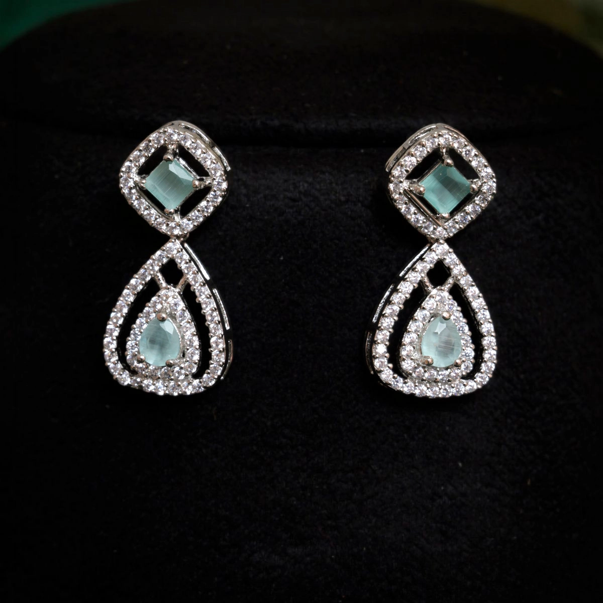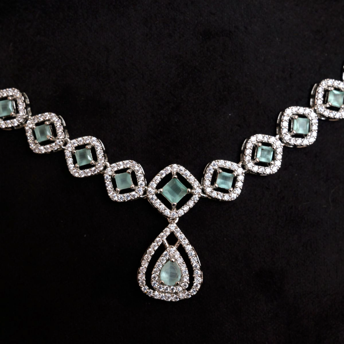 - Design: Alternating cushion‑cut mint stones with CZ borders; central pear‑drop; matching cushion‑to‑pear drop earrings