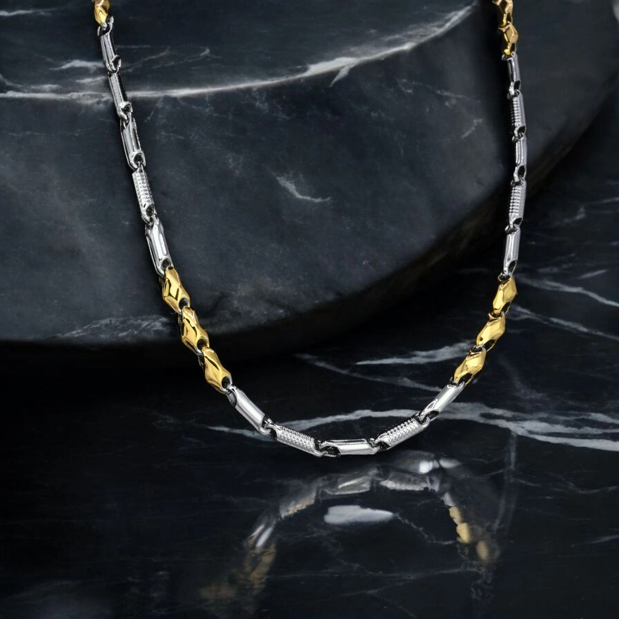 Command attention with the ultimate in modern sophistication—our Modern Dual-Tone Statement Chain for Men. This chain is designed for the man who isn’t afraid to stand out, offering a powerful blend of contemporary design and luxurious color. The piece showcases a unique and dynamic pattern, with sections of intricately textured, silver-toned links seamlessly transitioning into blocks of faceted, gold-toned links. This striking contrast creates a visually compelling piece that exudes confidence and impeccable style.