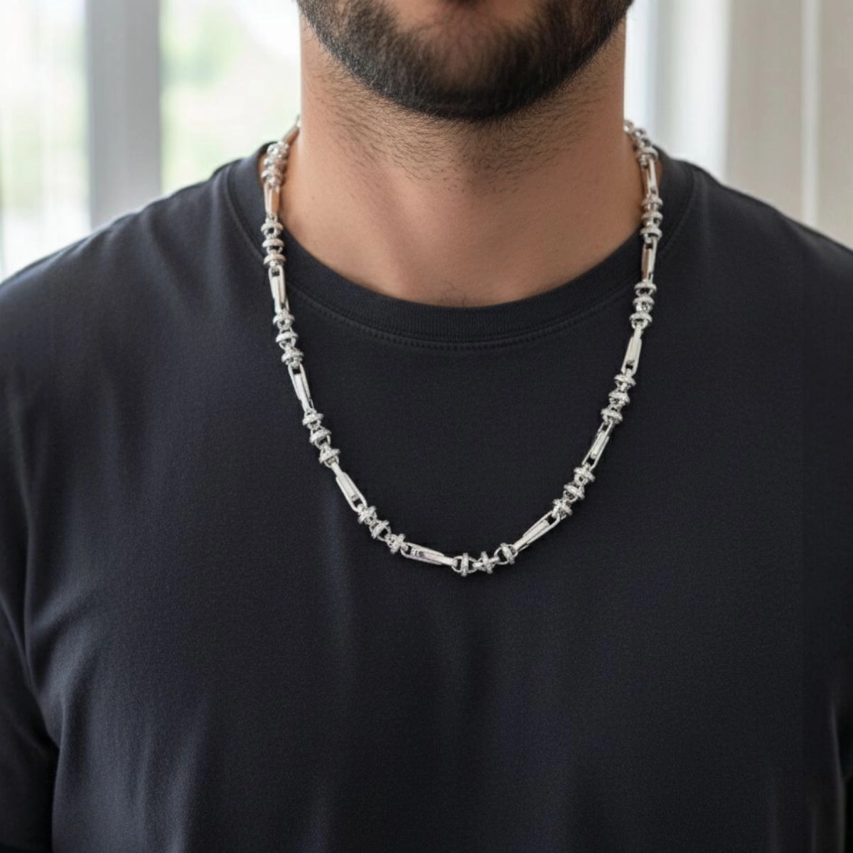 - Unique Design: Features a captivating alternation of sleek bars and intricately textured, ring-like links.