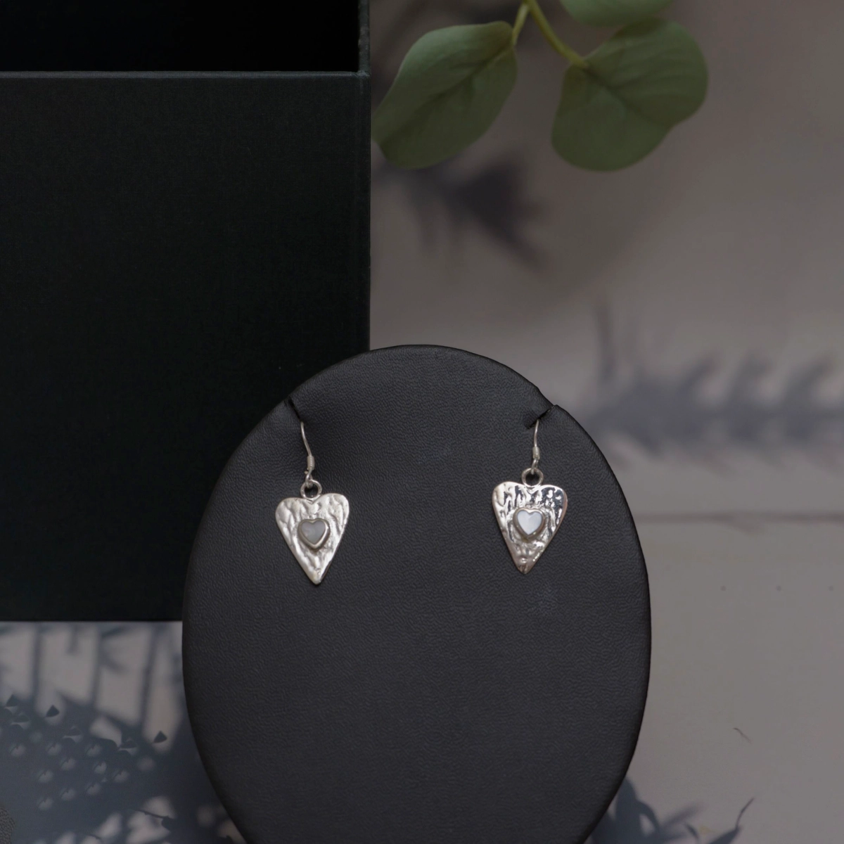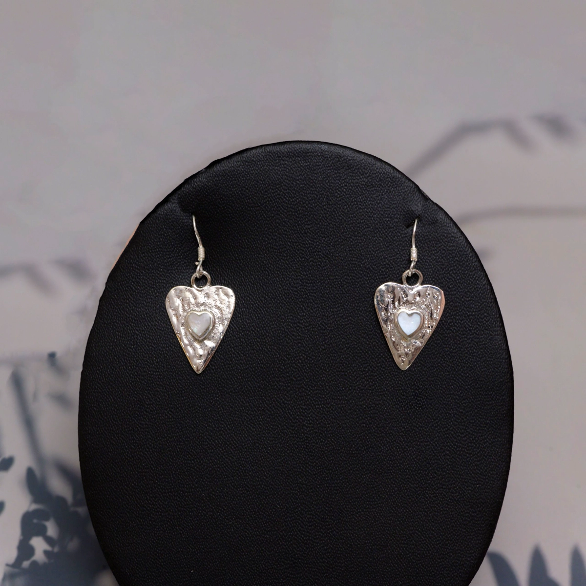 - Design: Hammered heart-shaped drop with a mother of pearl heart inlay