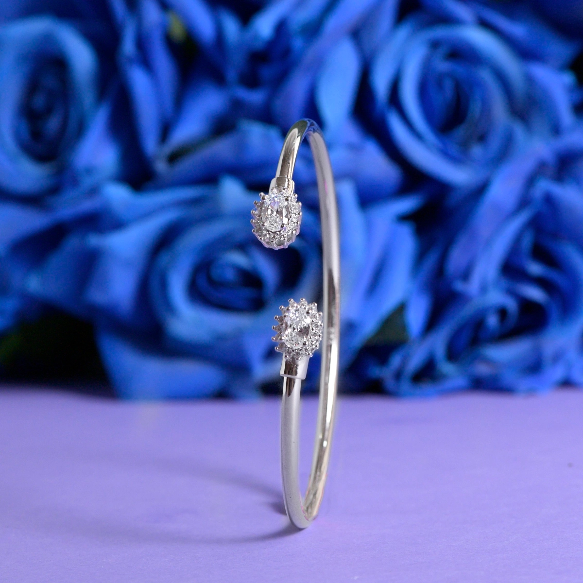 Elevate your wristwear with this Oval Pave CZ Bracelet in 925 Sterling Silver. The open cuff style is adorned with two oval-cut cubic zirconia stones surrounded by halos of brilliance, adding a radiant glow to your look. Its lightweight and adjustable design ensures comfort while making it perfect for both casual elegance and festive charm. A versatile addition to your silver jewellery collection.