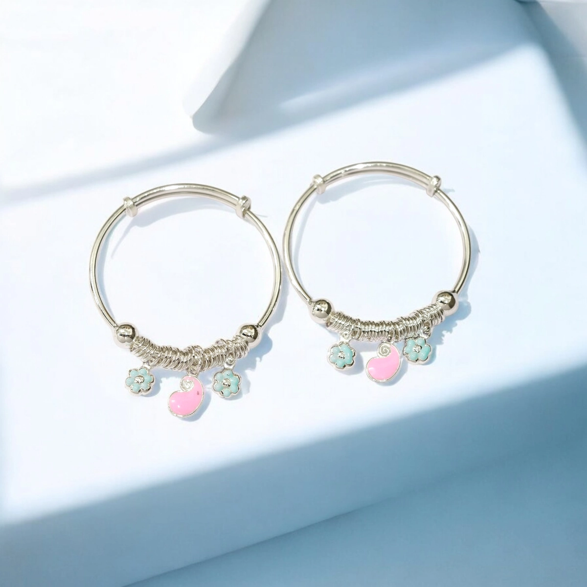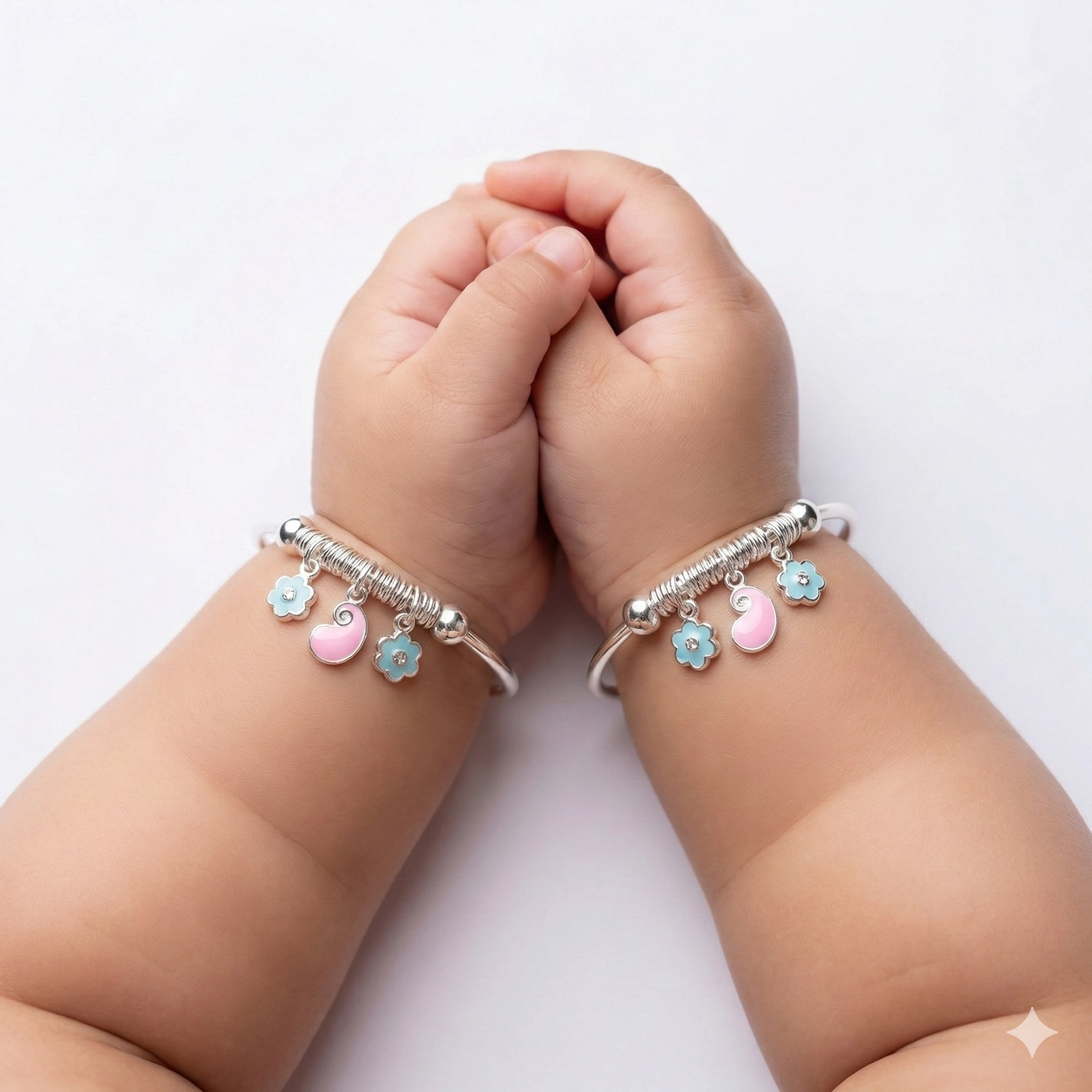 Wrap your little one in softness with the Sweet Pastel Paisley Blue Flower Kids Kadali. This delicate pair is designed to complement the innocence of early childhood. The central charm is a soft pink paisley (or mango motif) drop, a symbol often associated with sweetness and new beginnings. Flanking the pink drop are two charming baby blue flowers with tiny crystal-like centers, adding a subtle sparkle. The gentle pastel color palette evokes a sense of calm and joy. Crafted from high-polished 925 Sterling Silver, these pastel paisley blue flower kids kadali feature a smooth, adjustable sliding mechanism that ensures a secure and comfortable fit as your baby grows.