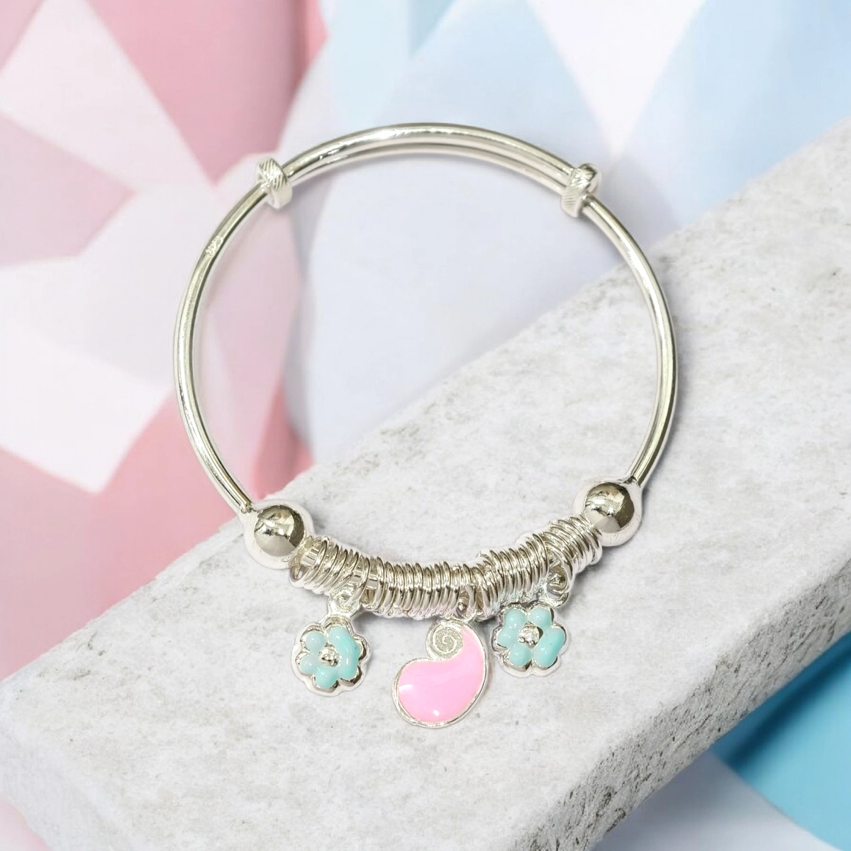 Adorn their little wrists with these gentle pastel paisley blue flower kids kadali, featuring a sweet pink paisley charm nestled between two soft blue enamel flowers.