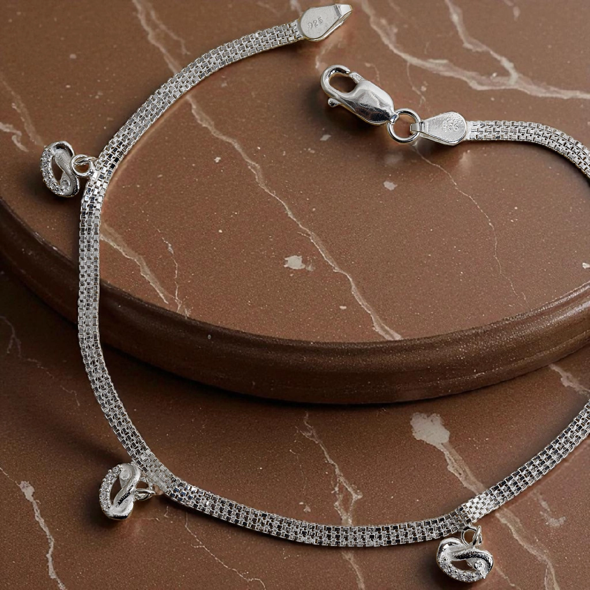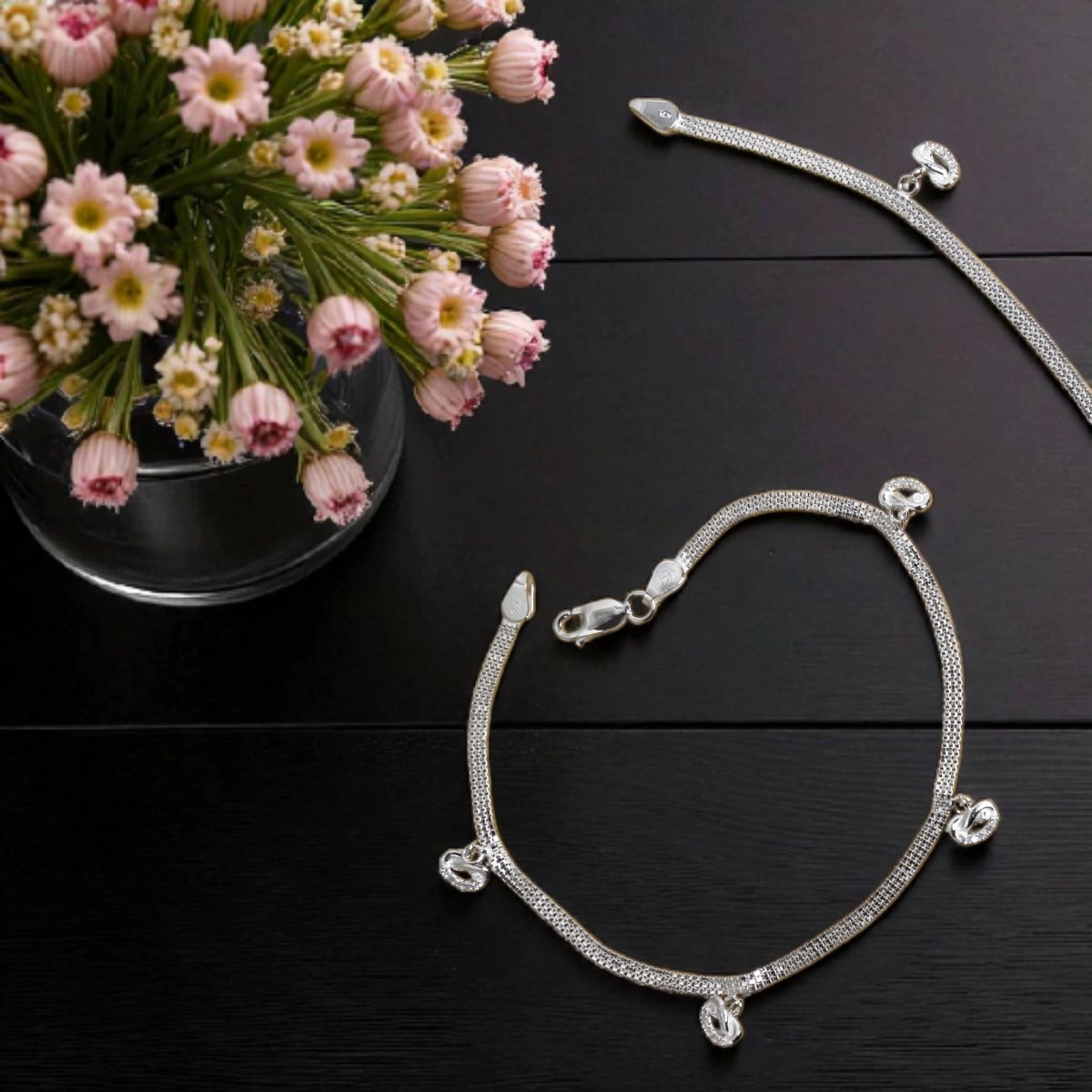 Pebble Charm Anklets – Dual Mesh 925 Silver with Dangling Accents