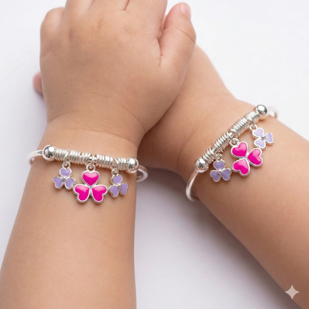 Bring the joy of a garden to your little one’s wrist with the Pink Purple Floral Kids Kadali. This enchanting pair is designed to capture the sweetness of childhood. The centerpiece features three dangling floral charms: a bold, bright pink blossom in the middle, flanked by two soft lavender flowers on either side. The charms are suspended from a classic silver coil, adding a playful jingle and texture that kids love. Crafted from high-quality 925 Silver with a brilliant polish, these kadali are durable and cute. The smart adjustable design ensures they fit comfortably from toddlerhood through their early school years.