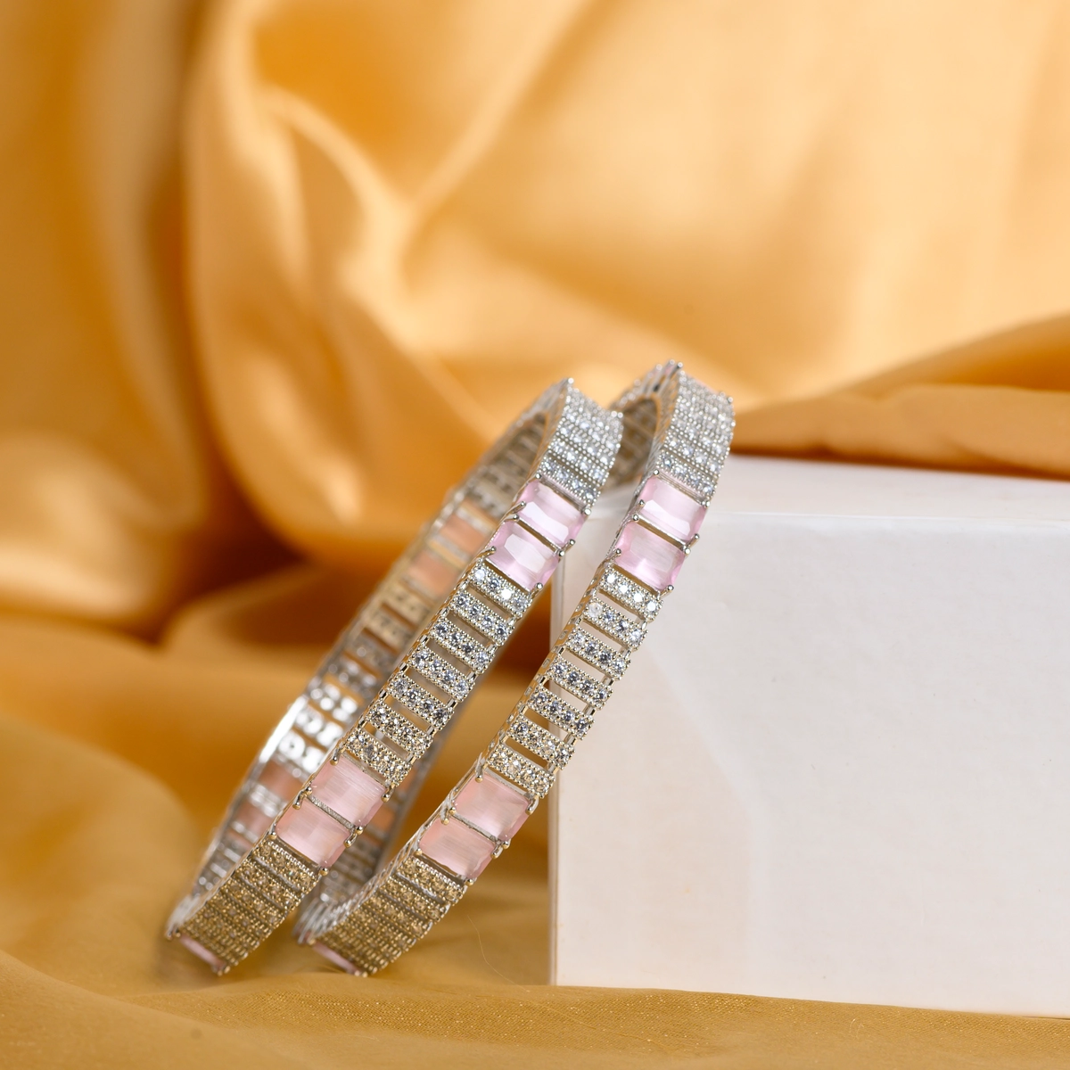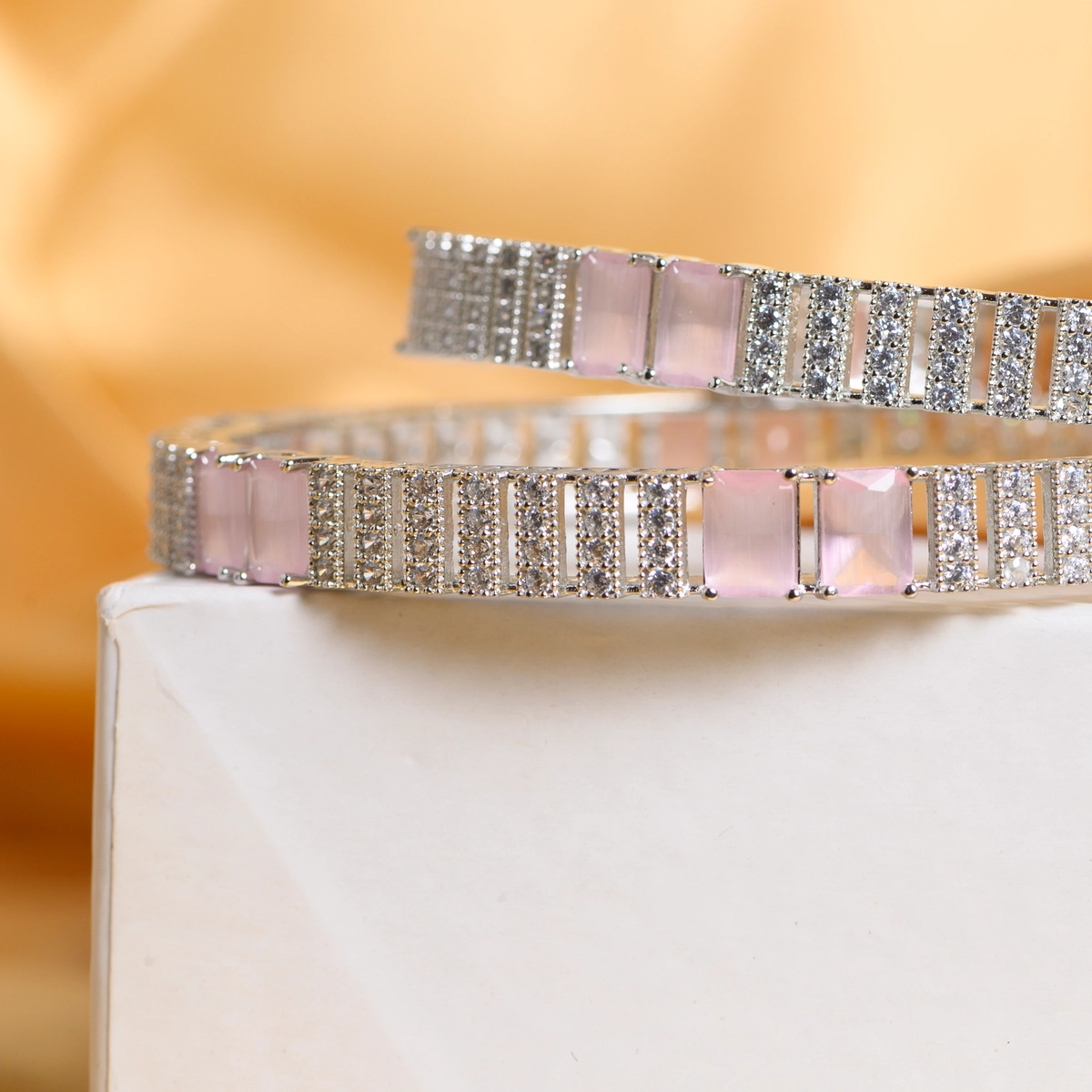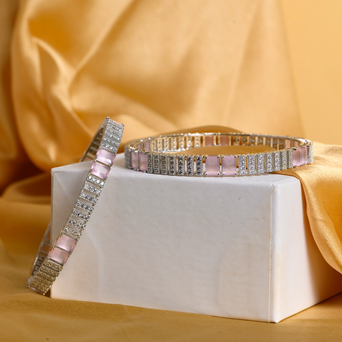 Step into sophistication with these statement Pink Stone CZ Layer Bangles, handcrafted in 925 sterling silver. Designed with pastel pink stone accents framed by shimmering CZs, these bangles feature a broader, layered pattern that adds grandeur and sparkle. Perfect for festive occasions, weddings, and parties, they’re the ultimate blend of grace and glamour. A must-have for those who love making a statement with their jewellery.